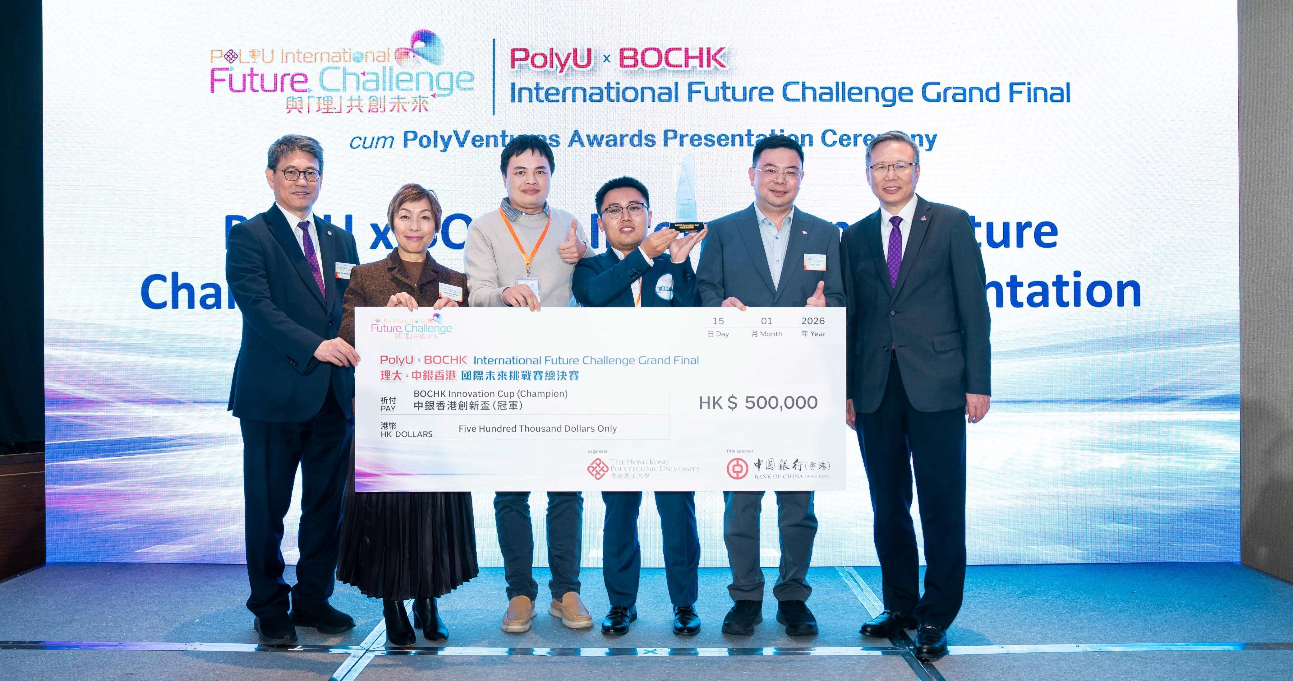 香港理工大学(理大)一直致力于世界领先的研究及创新,矢志把崭新科研突破转化为可行的解难方案和创新项目,贡献社会。理大去年启动旗舰创新创业比赛「理大国际未来挑战赛」,并获中国银行(香港)(下称「中银香港」)冠名赞助于今日举行的总决赛暨颁奖典礼。来自香港及内地共七个赛区、共15支晋级的初创精英,于总决赛竞逐多个奖项。最终由来自晋江赛区的晋江智动创新科技有限责任公司,以「全球领先的可穿戴与机器人传感方案提供商」项目脱颖而出,勇夺「中银香港创新杯」及50万港元奖金,亦将得到落户理大前海前沿技术创新中心的机会,并获该中心提供8万港元孵化资助。