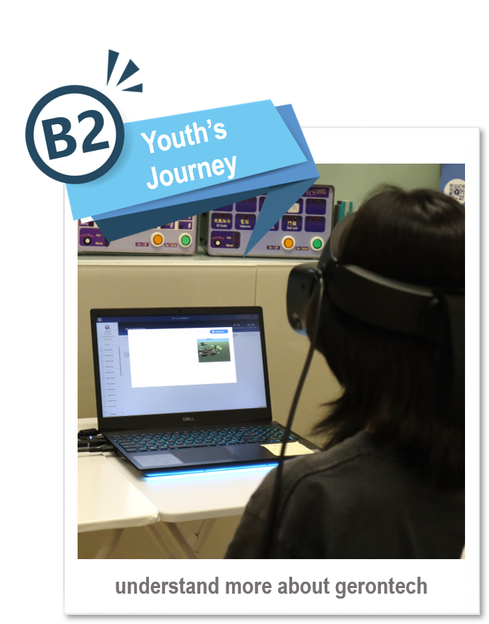 The following thematic journeys are available: B1. Gerontech beginner's journey (for children aged 12 and below) - introductory of gerontech B2. Gerontech youth's journey (for secondary & university students) - understand more about gerontech B3. Gerontech golden journey (for older persons & caregivers) - explore the full collection of gerontech items B4. Gerontech expert's journey (for staff of the elderly care sector) - exchange the latest gerontech information with professionals |