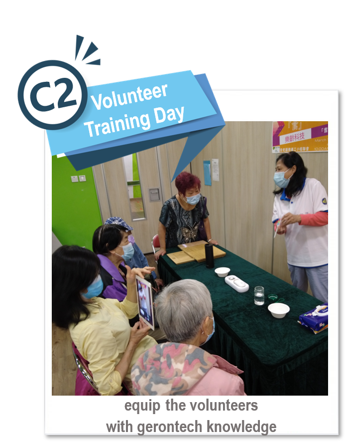 The following outreach activities are available: C1. Gerontech community group - attract public interest in gerontechnology C2. Volunteer training day - equip the volunteers with gerontech knowledge C3. Thematic exhibition - free loan gerontech items to raise public awareness about the gerontechnology C4. Online activities - online guided tour, webinar, product sharing session |