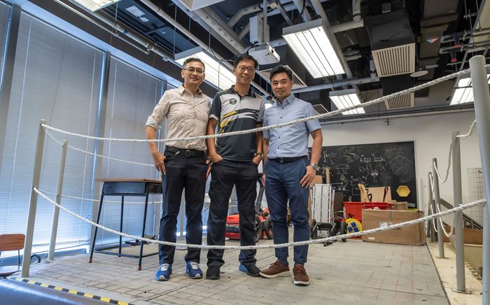 Wallace(中)與CFSO的高級物業管理經理戚子翔(左)及技術經理張文傑(右)於LSGI的實驗室內合照。