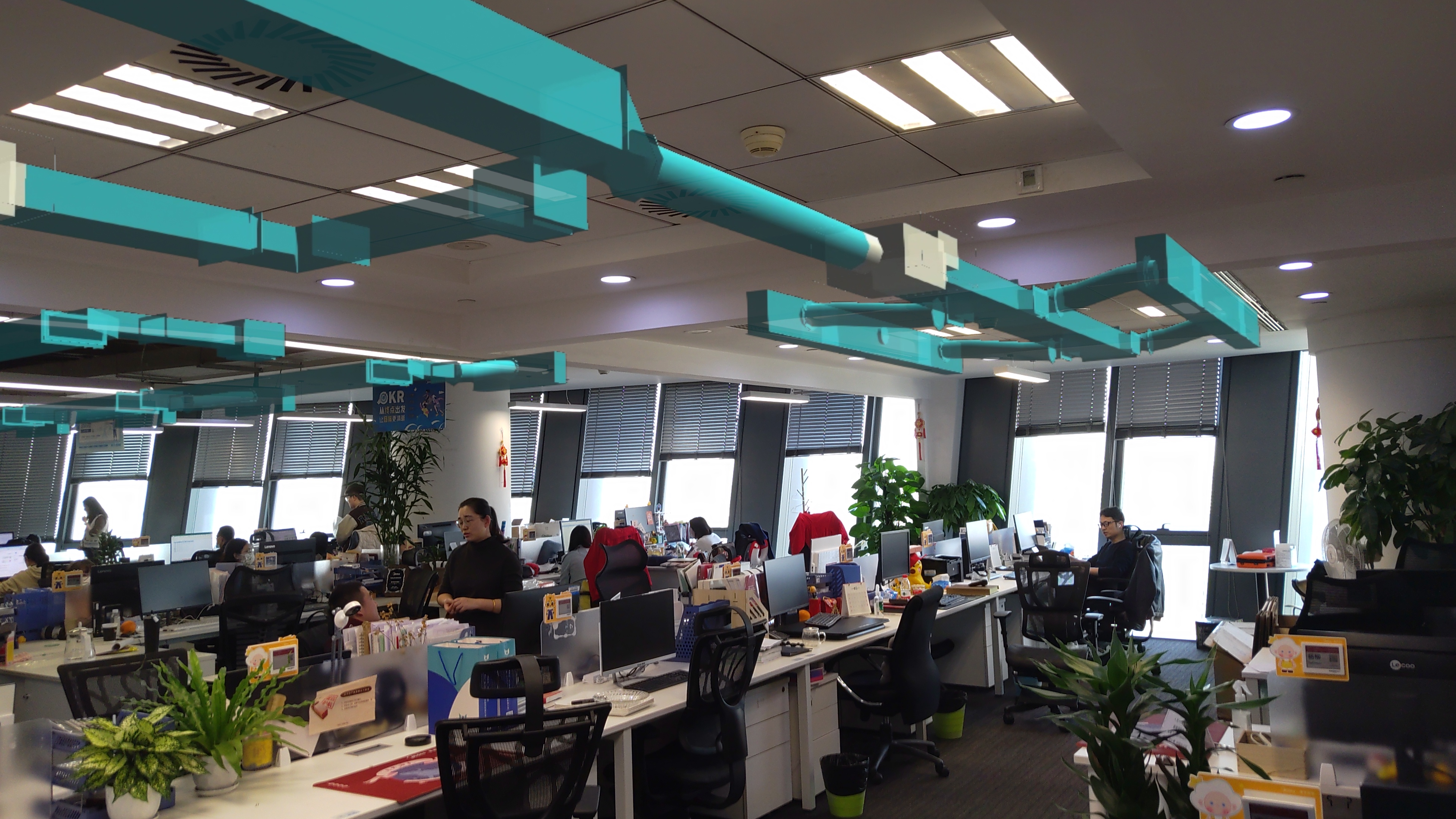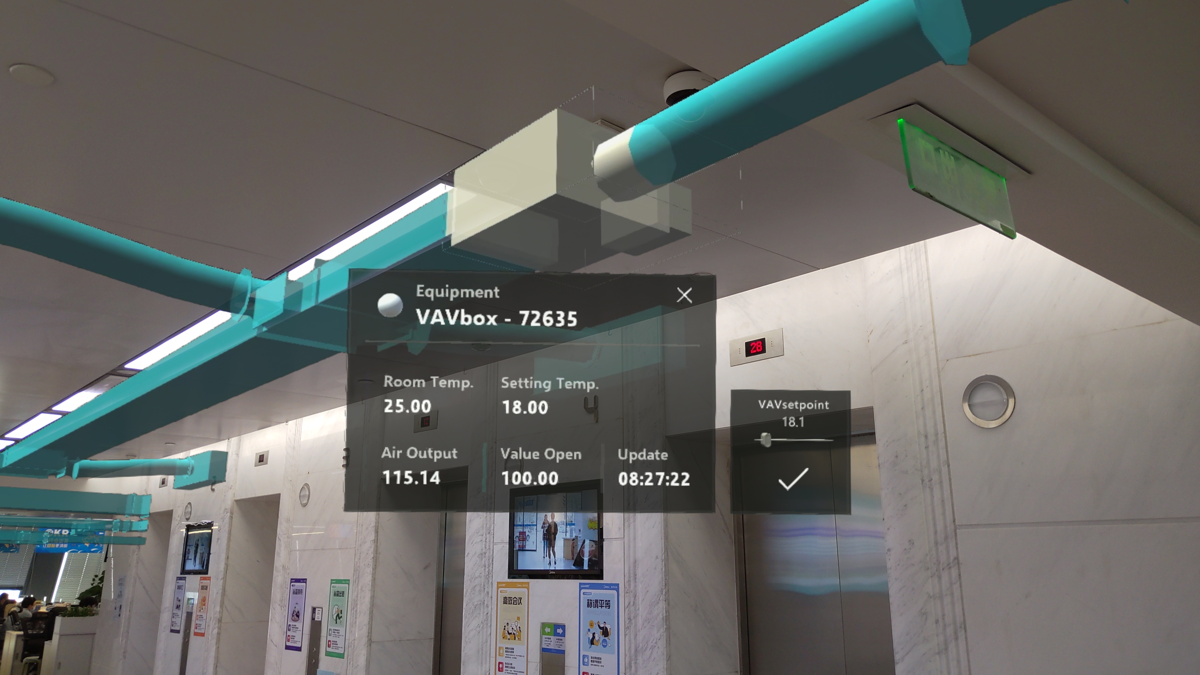「穿戴混合現實眼鏡之後,埋藏在牆身內或天花上的冷氣系統都變得肉眼可見。借助開發的室內導航技術,設備維修保養人員可以輕鬆從大樓內的任何一處找到前往出現問題設備的路線圖。到達後,他們可以在現場同時看到實際環境,並透過虛擬介面瞭解到肉眼看不到的設備運行參數以及基於人工智能的數據分析結果,從而更容易做出即時決策。」這套智慧便利的系統甚至能讓沒有人工智能技術背景的維修保養人員都能靈活使用。