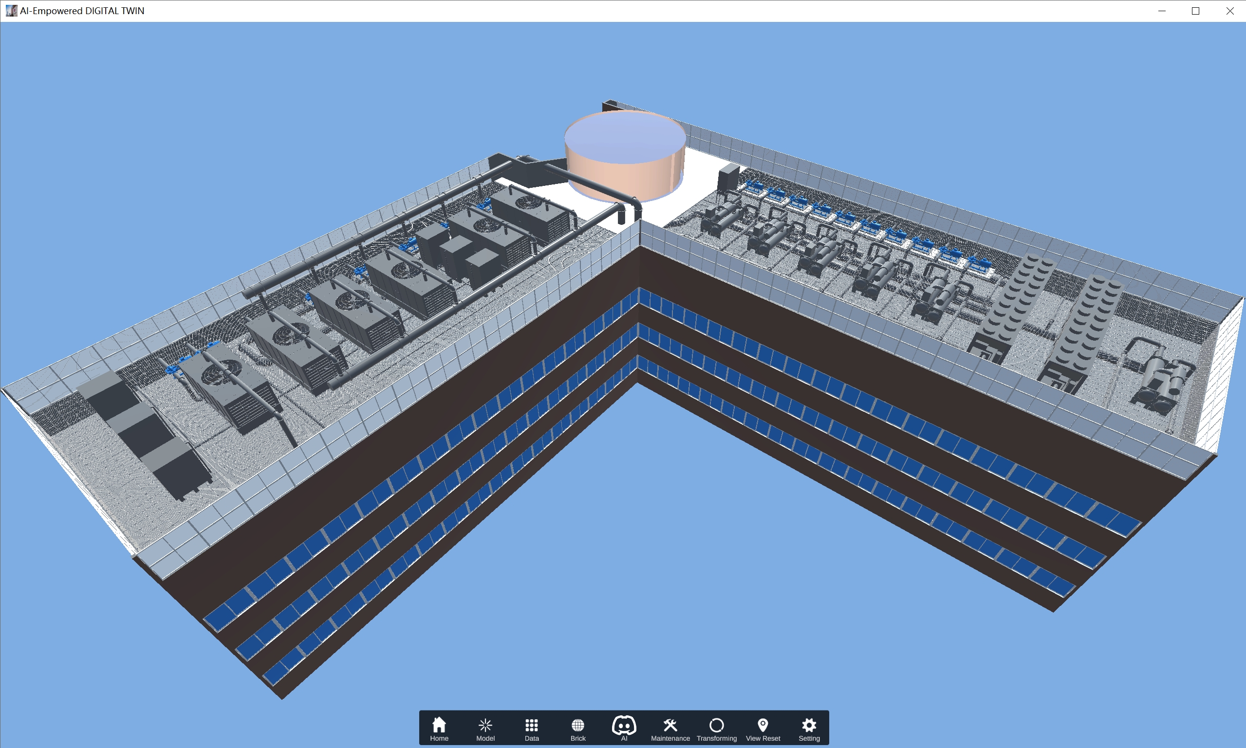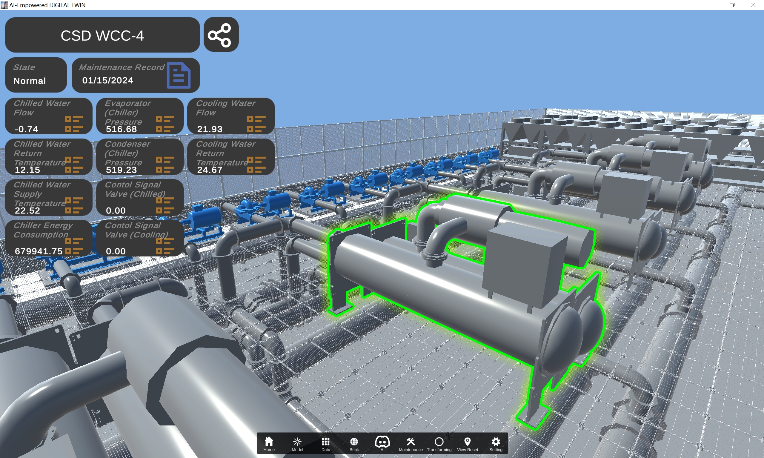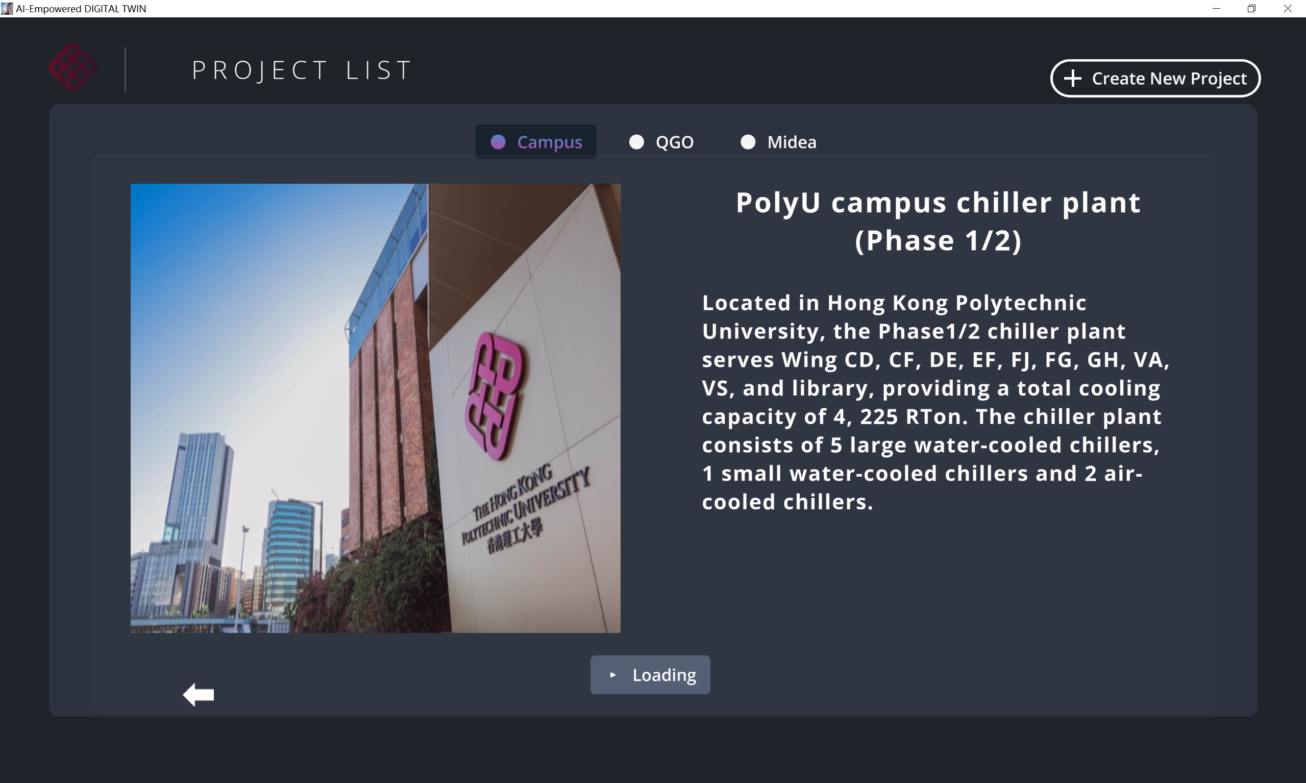 對此,香港理工大學(理大)建設及環境學院副院長肖賦教授率領團隊開發了一套數字孿生系統,並應用於理大校園的中央冷氣系統的節能優化和維修保養,通過收集實時運行數據,並採用AI技術分析數據,結合物理和工程知識,提供能夠提升能源效率的優化運行策略和預測性維護方案。這套數字孿生系統整合了MR、BIM、建築自動控制系統(BAS)、物聯網(IoT)以及多源異構數據融合,開發了Windows以及Hololens 2兩種版本。