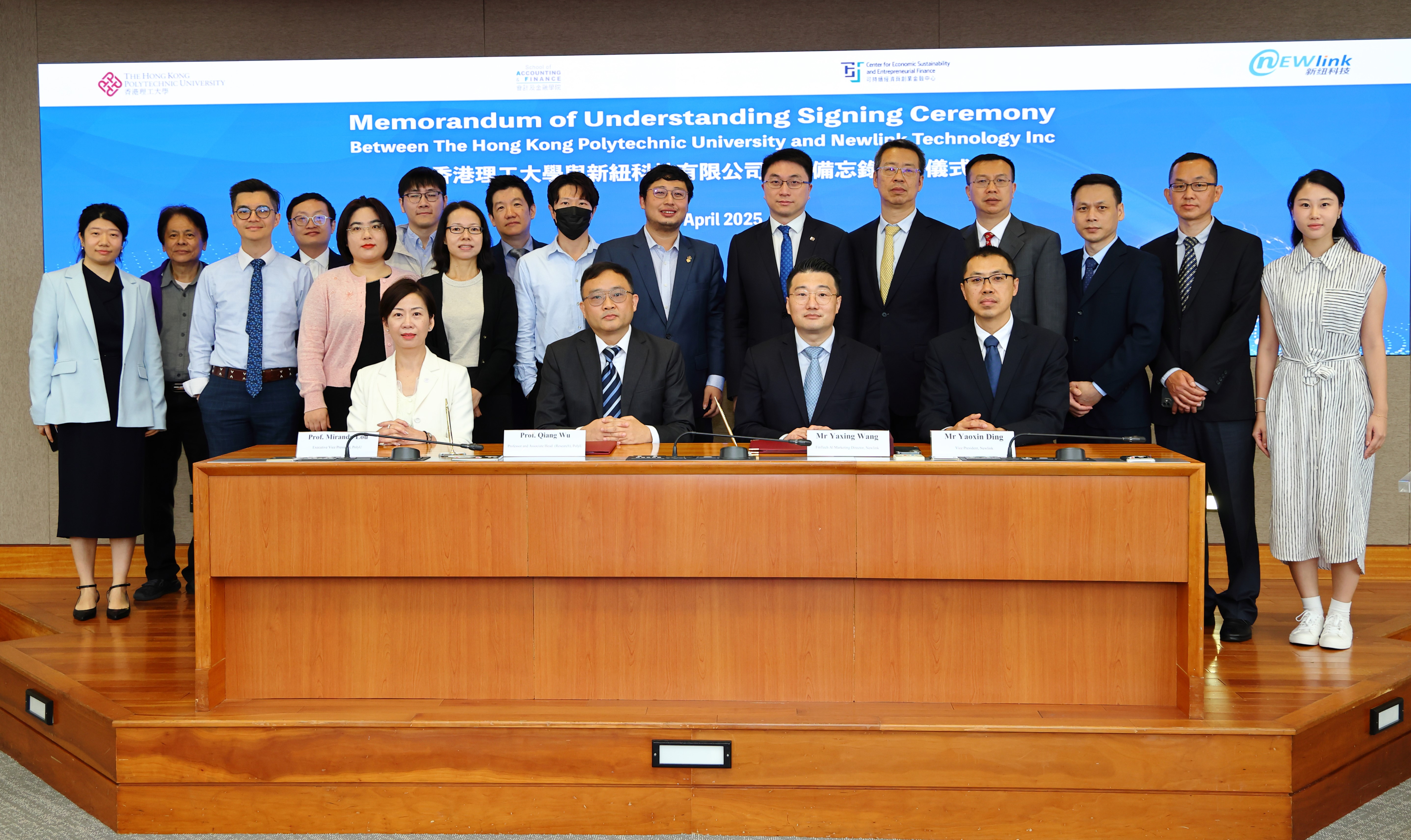 The Hong Kong Polytechnic University (PolyU), represented by the Center for Economic Sustainability and Entrepreneurial Finance (CESEF) of the School of Accounting and Finance (AF), signed a Memorandum of Understanding (MoU) with Newlink Technology Inc. (Newlink) on 11 April 2025 to make collaborative effort on research studies for FinTech development.