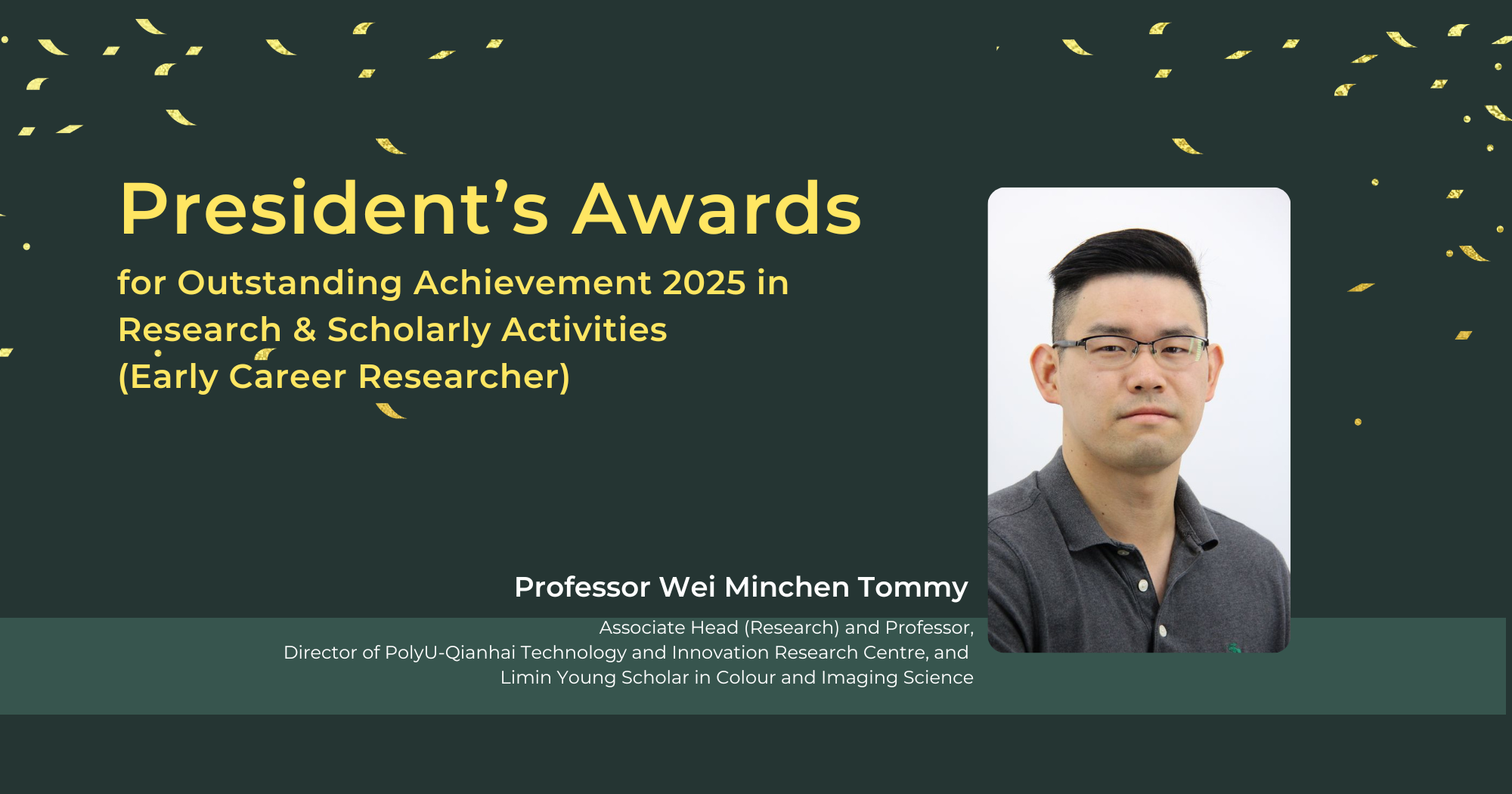 Congratulations to Professor Wei Minchen Tommy, Associate Head (Research) and Professor, Director of the PolyU-Qianhai Technology and Innovation Research Centre, and Limin Young Scholar in Colour and Imaging Science, for being awarded the President’s Awards for Outstanding Achievement 2025. This is the highest institutional accolade, recognizing the outstanding achievements of our staff.