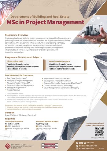Students may pursue their studies either on a full-time or part-time mode. Students enrolling in the full-time mode are recommended to complete 7 subjects and a dissertation. For the part-time mode, the first year emphasizes project management processes and techniques, providing students with contemporary and in-depth knowledge of project management. This is supplemented by insights into the major factors that affect real estate development. In the second year, elements such as value management, finance and international construction provide specialized knowledge of construction project management at the macro level.