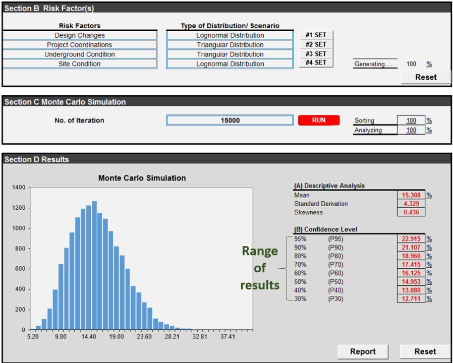 2) To formulate a systematic approach for estimating risks and contingencies by using Monte Carlo simulation, and