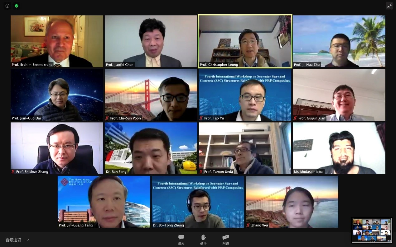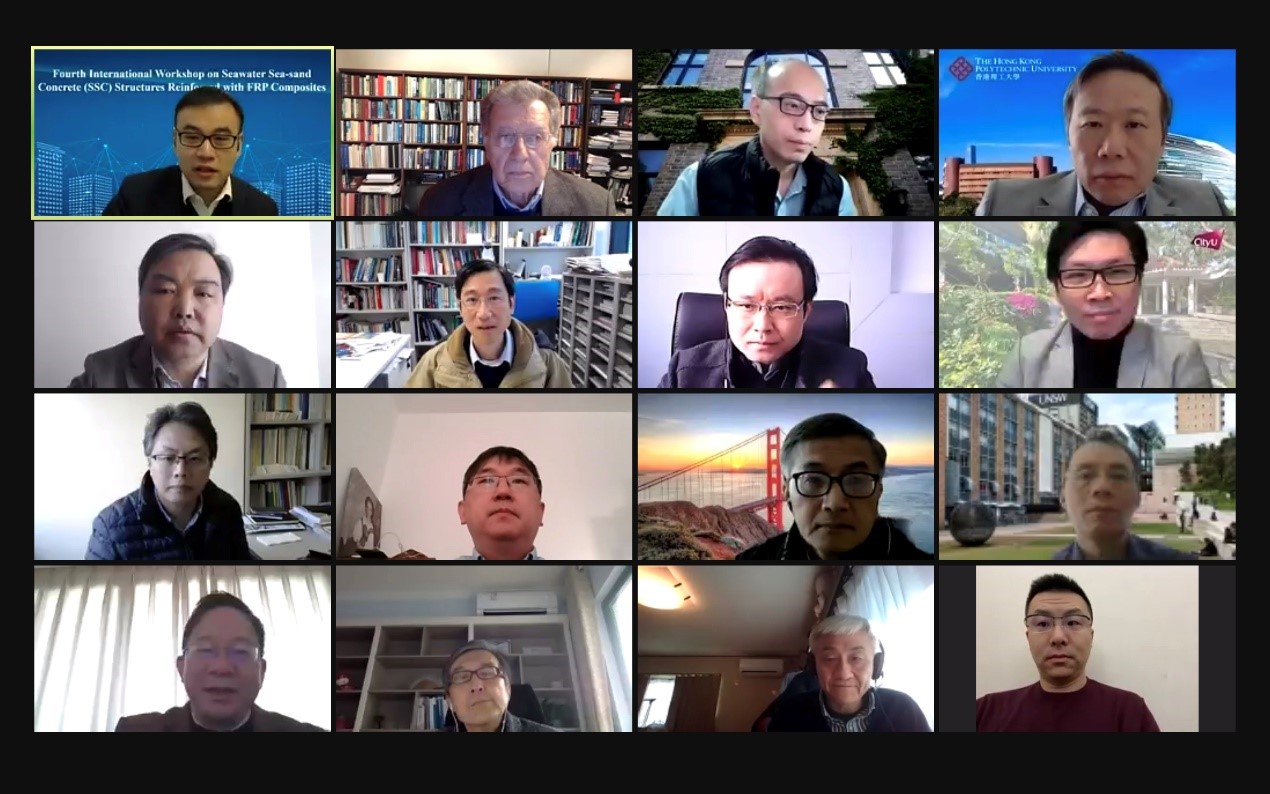 The Fourth International Workshop on Seawater Sea-sand Concrete (SSC) Structures Reinforced with FRP Composites (4th FRP-SSC Workshop) was successfully held online on 9-10 January 2021. This workshop was co-organized by the Department of Civil and Environmental Engineering and the Research Institute for Sustainable Urban Development of the Hong Kong Polytechnic University. Professor Teng Jin-guang, a chair professor of the Hong Kong Polytechnic University, academician of the Chinese Academy of Sciences, and president of the Hong Kong Polytechnic University, served as the advisory chairman of the workshop organizing committee; Professor Yu Tao served as the chairman of the workshop organizing committee. A series of presentations were given by over 30 invited speakers to share their latest findings in the related area, besides, this workshop attracted nearly a thousand experts and scholars from home and abroad to register.
