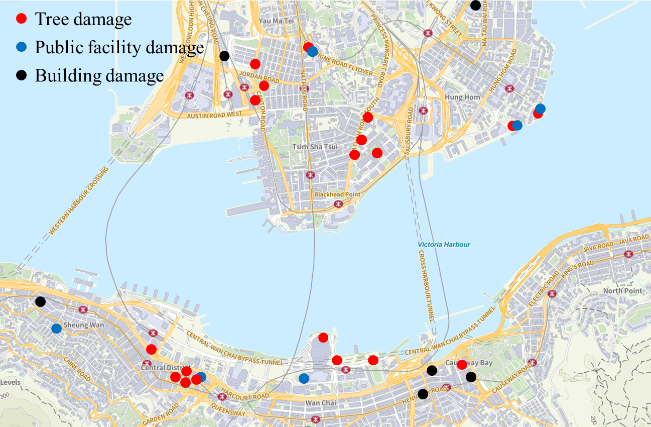 The TRS team members Mr. Huan Yue, Mr. De-Hui Ouyang, Ms. Ling-Yi Diao, Mr. Min Deng, and Mr. Xin-Yuan Liu conducted field investigations in Kowloon and Hong Kong Island on 21 July 2025. Findings include: 18 locations with snapped tree trunks or completely uprooted large trees, 5 locations with damaged public facilities (road signs, billboards, playground equipment, construction machinery), 5 locations with building damage (tilted scaffolding, fallen billboards, peeling facades), 2 locations with shattered curtain walls on high-rise buildings.