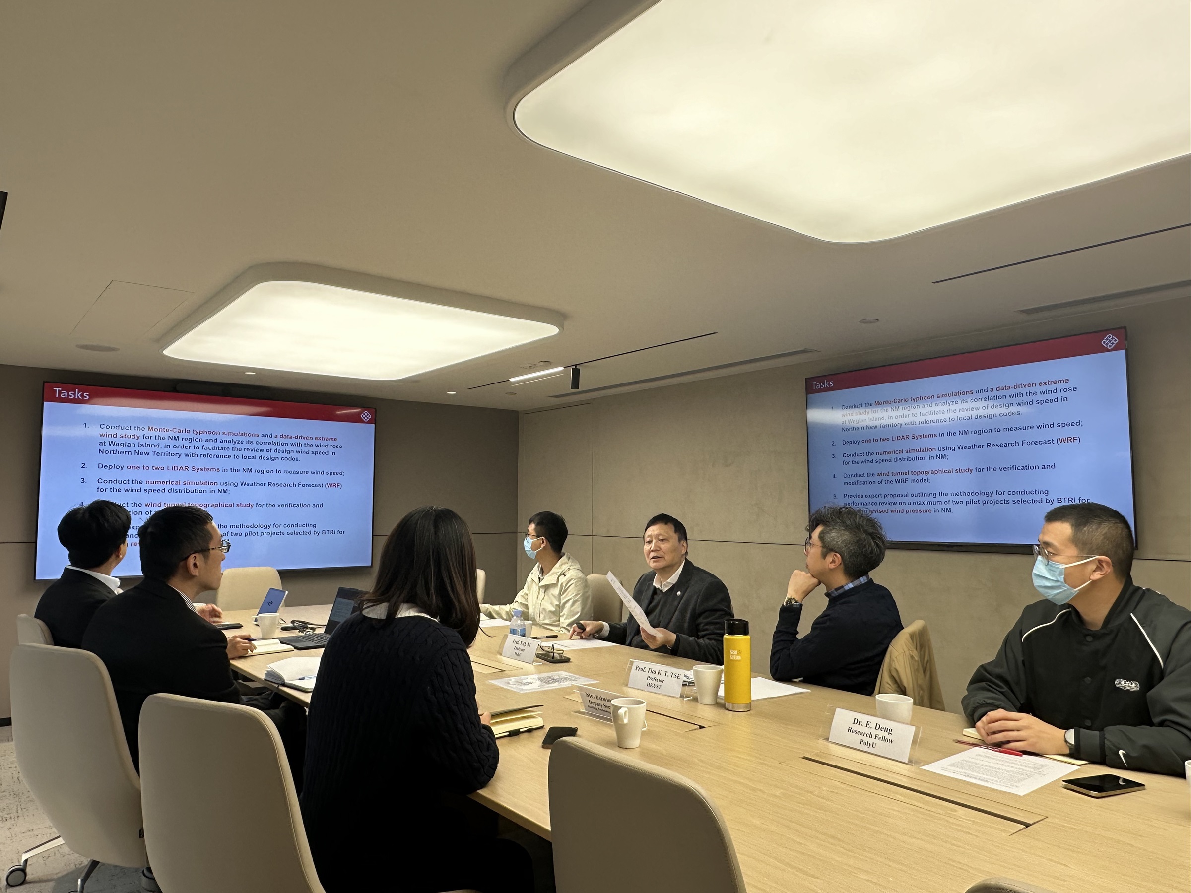 On 6 Jan 2026, Prof. Yi-Qing Ni, Dr. E. Deng (Research Fellow), Mr. Huan Yue (Research Student), and Mr. Jian Wang (Research Assistant) from The Hong Kong Polytechnic University, along with Prof. Kam Tim Tse from The Hong Kong University of Science and Technology, visited the Building Technology Research lnstitute to discuss wind environment research in Hong Kong’s Northern Metropolis. During the meeting, Prof. Ni outlined the team’s proposed research methods and technical framework, including Monte Carlo typhoon simulation, LiDAR field observations, WRF numerical model, and wind tunnel test. The participants further discussed potential sites for the installation of additional LiDAR systems in the Northern Metropolis and exchanged views on key technical aspects of WRF simulations and wind tunnel test, providing a solid foundation for subsequent research.