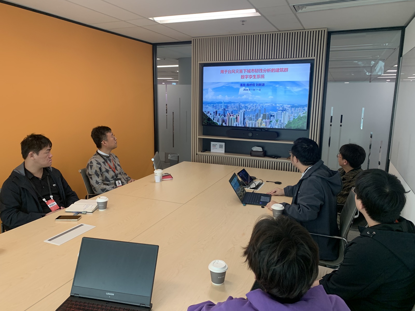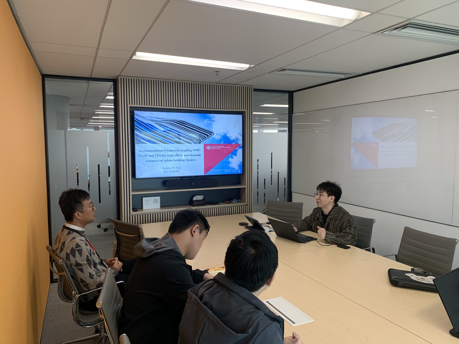 On the afternoon of 14 Jan 2026, Dr. Yue Dong, Dr. Xiu-Yu Chen, Mr. Hang Du, Mr. Zi-Xuan Zeng, and Mr. Xin-Yuan Liu visited Arup and held a meeting with Dr. Xiao-Ye Yu on research related to high-rise buildings. Mr. Hang Du presented a case study of the Shenzhen Galaxy Twin Towers, introducing a coupled WRF and LES approach for evaluating wind loads and wind-induced responses of high-rise buildings. Dr. Yue Dong introduced a digital twin framework for building clusters, covering automated building geometry modeling, local wind field prediction, and wind speed time history analysis. The discussion also covered topics including the simplification of building-cluster models in Hong Kong, Hong Kong bridge wind resistant design codes, and LiDAR data analysis.