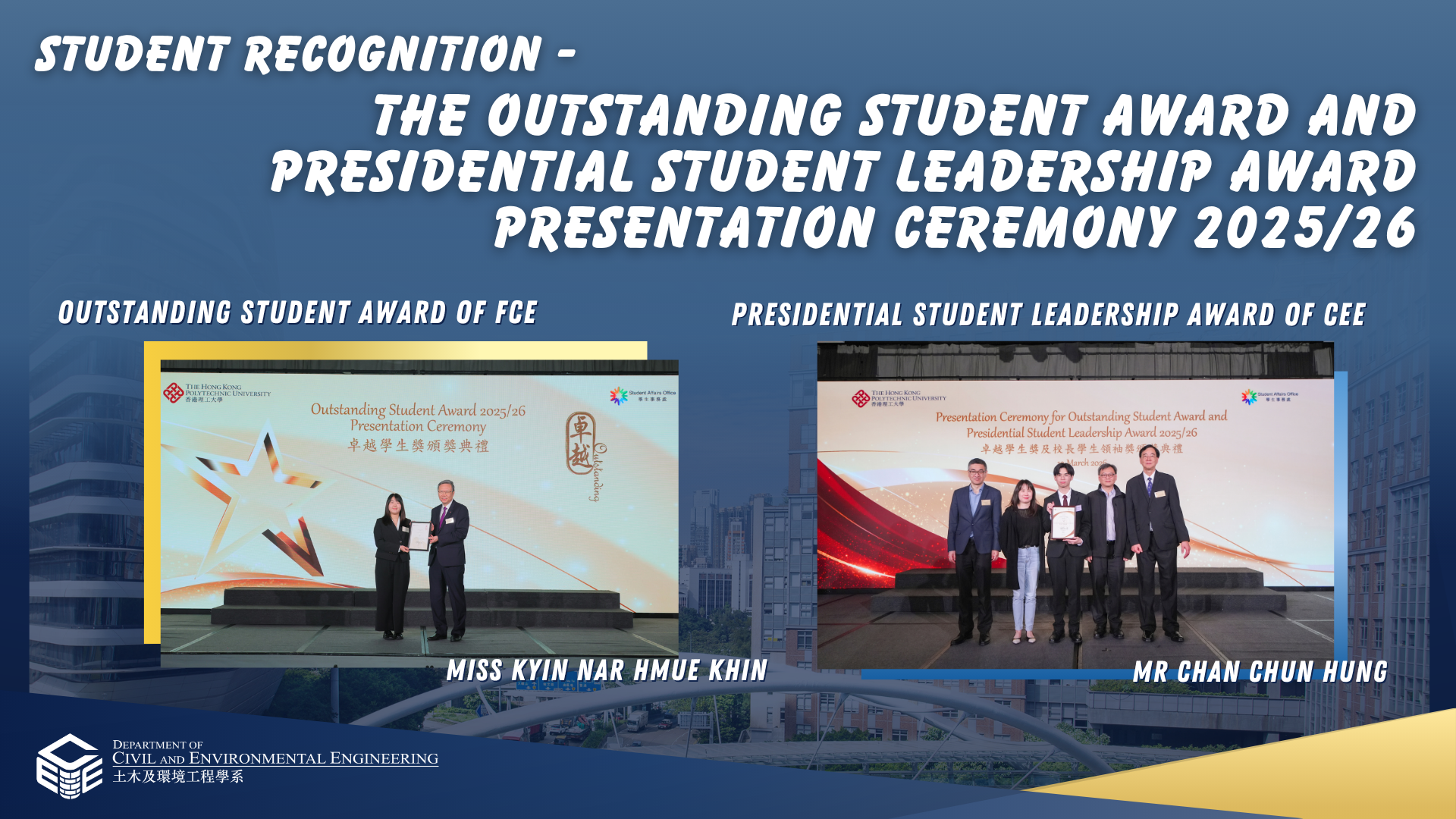 We are proud to announce the remarkable achievements of CEE students, who have been honoured with two distinguished awards for the 2025/26 academic year, The Presidential Student Leadership Award (PSLA) of Department of Civil and Environmental Engineering and The Outstanding Student Award (OSA) of Faculty of Construction and Environment. There achievements highlight the dedication and passion of our students in both academic excellence and leadership.