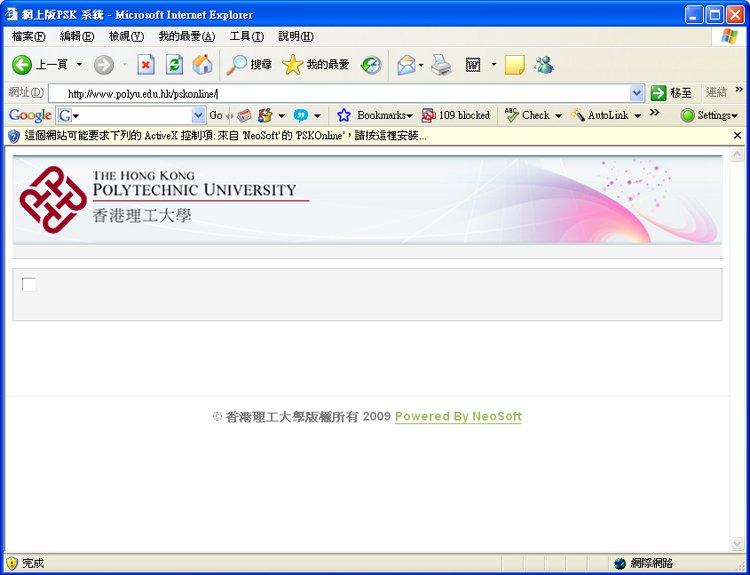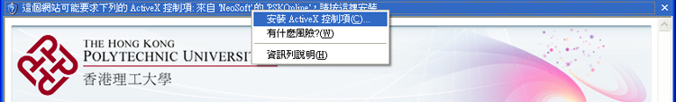 | 5. | 該文字說明是 "這個網站可能要求下列的ActiveX控制項:來自'NeoSoft'的'PSKOnline',請按這裡安裝.." |