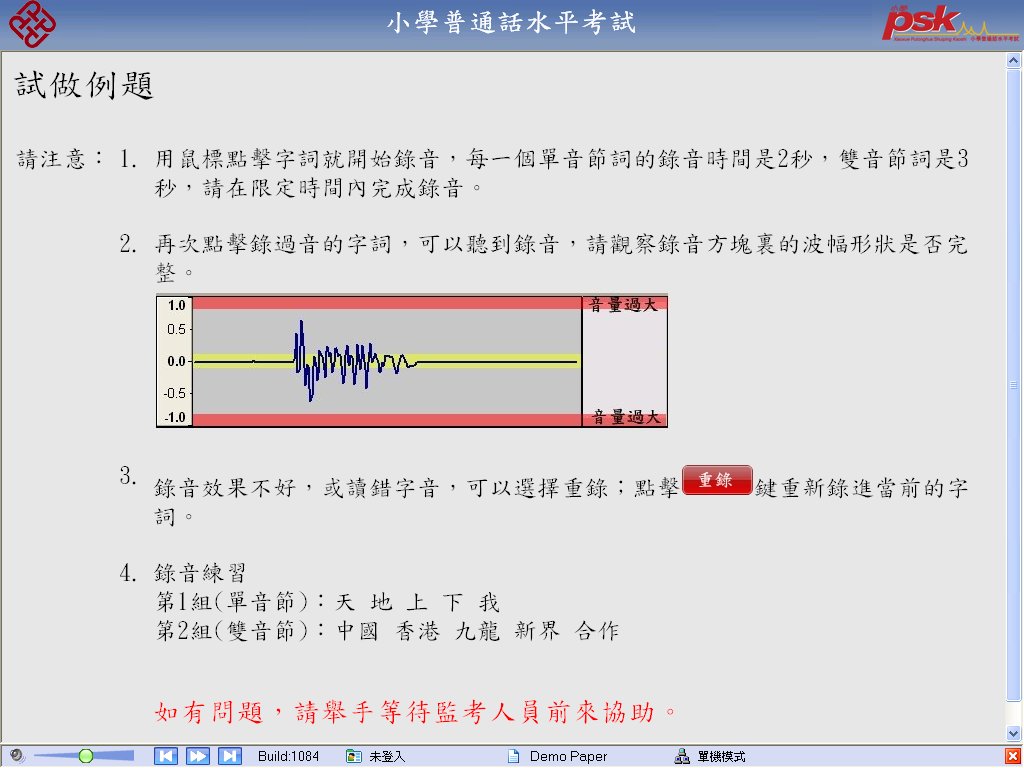 | 17. | 請按“播放錄音”聆聽你剛才所說的話。然後按“進入系統”進入普通話水平考試系統試用(網上版)。普通話水平考試系統試用(網上版)會佔用你熒幕,並有下面的畫面。 |