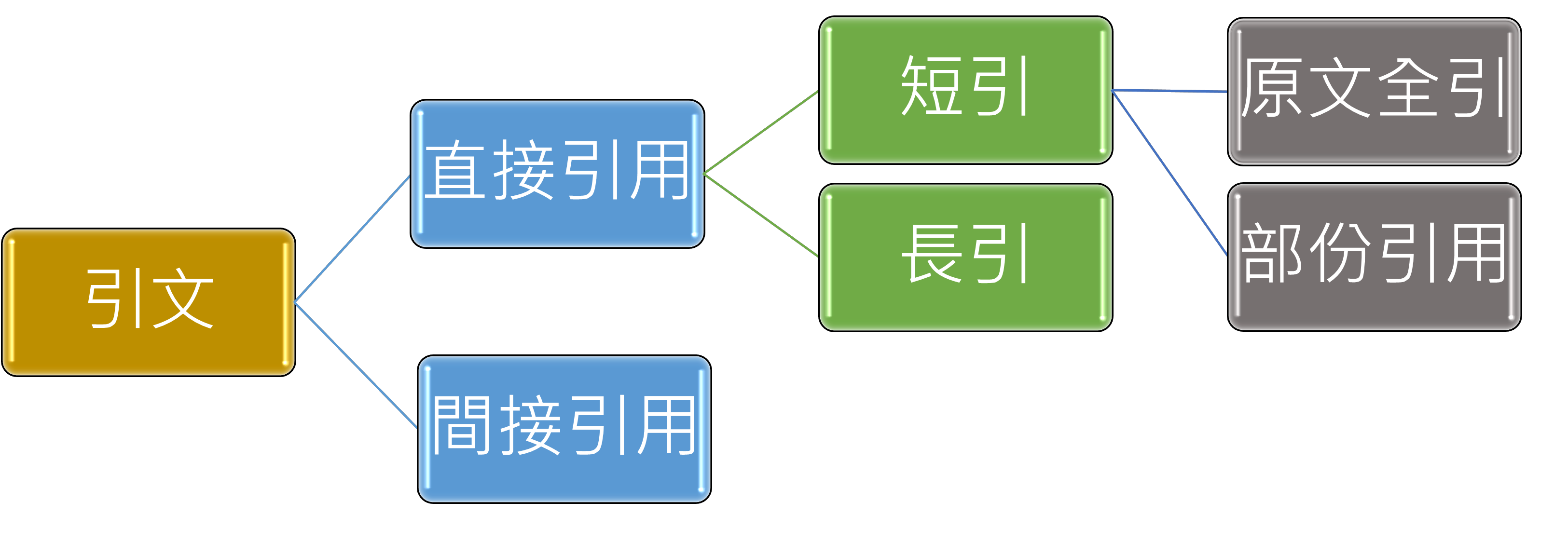 - 直接引用——直接把別人的原文轉引至論文內,並以引號標明範圍。當中又可細分「短引」及「長引」 。