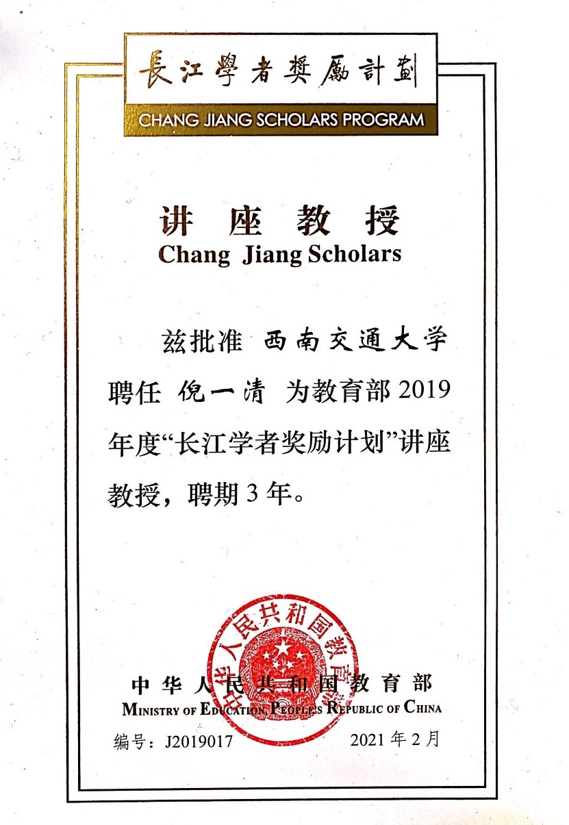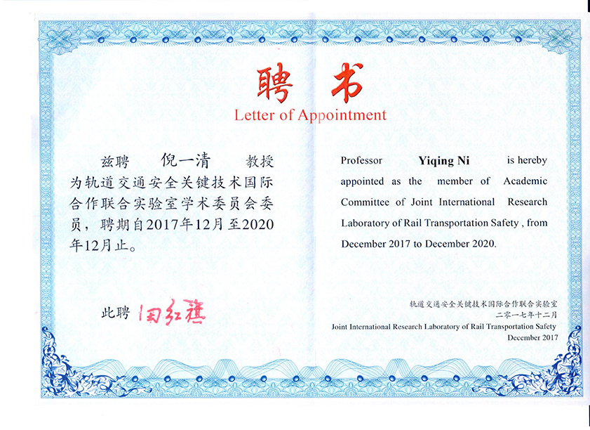 軌道交通安全關鍵技術國際合作聯合實驗室學術委員會委員 — 倪一清教授
