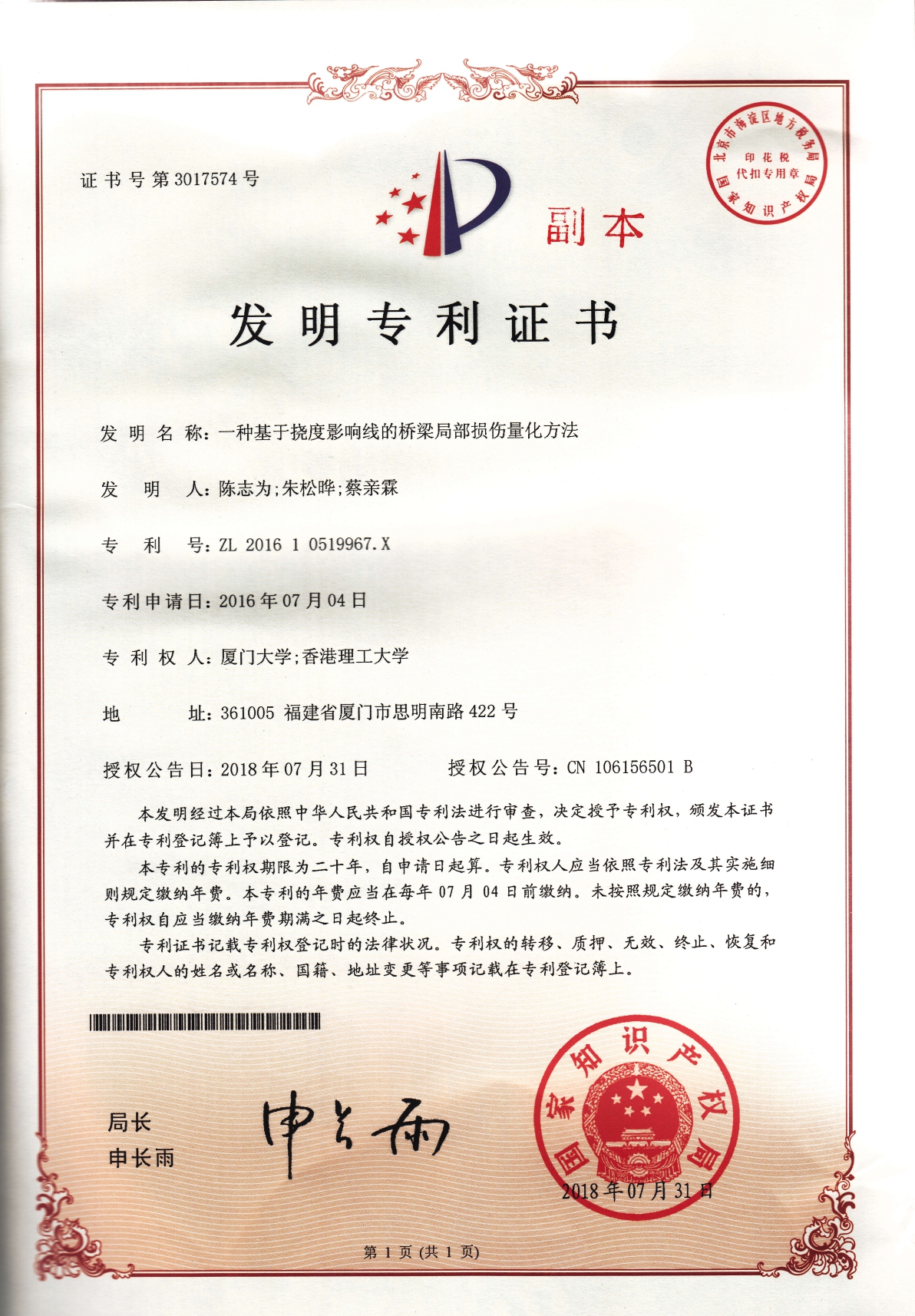 Chinese Patent:A bridge damage quantification method based on deflection influence lines (一種基於撓度影響線的橋樑局部損傷量化方法) — Prof. Songye Zhu