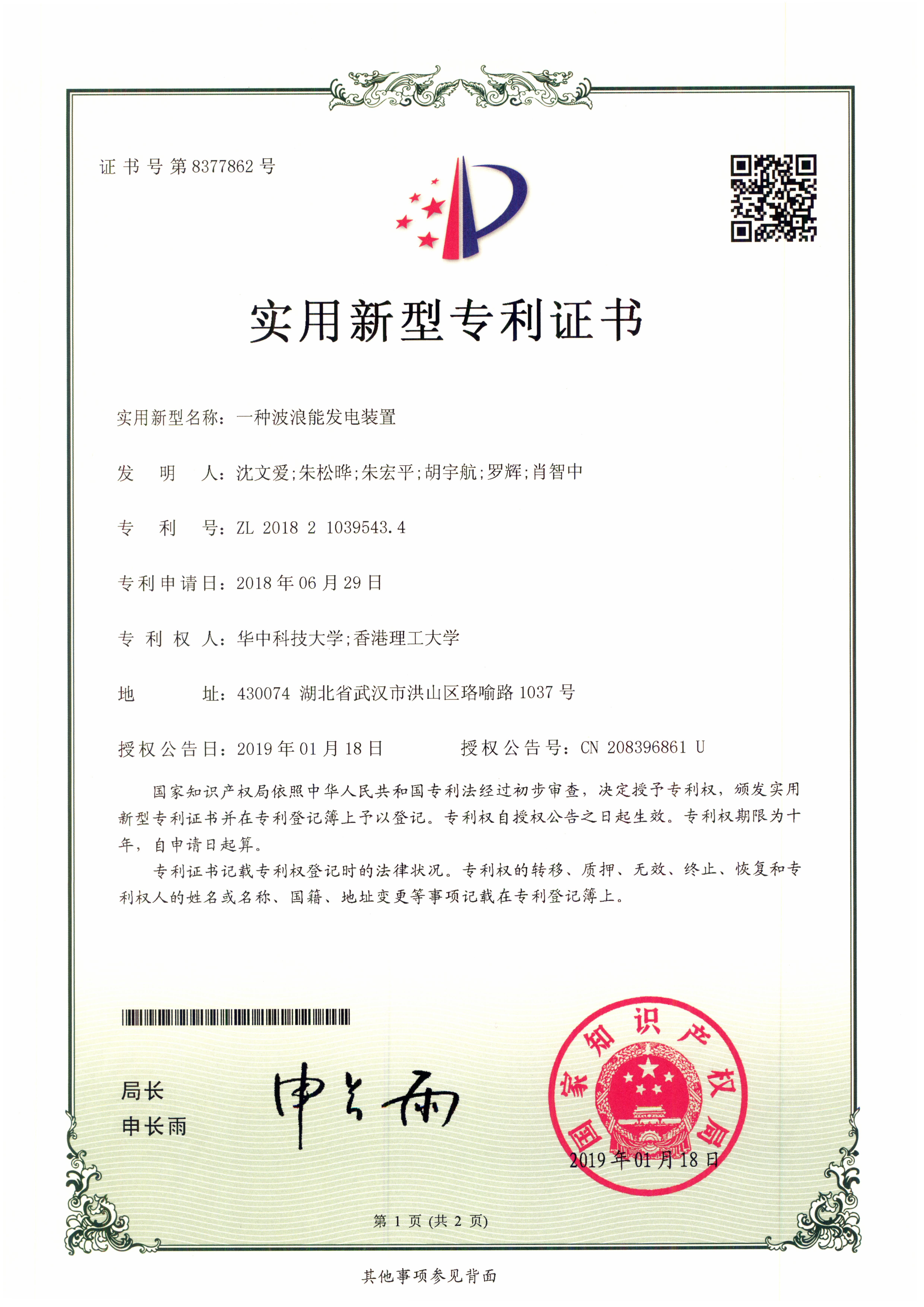 Chinese Patent:A novel wave energy converter (一種波浪能發電裝置) — Prof. Songye Zhu