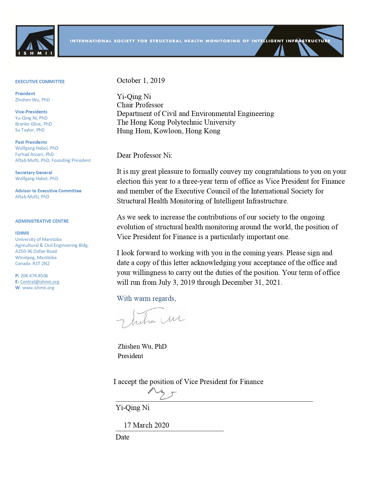 Appointment as a Co Editor-in-Chief of the editorial board of Intelligent Transportation Infrastructure — Prof. Ni Y.Q.