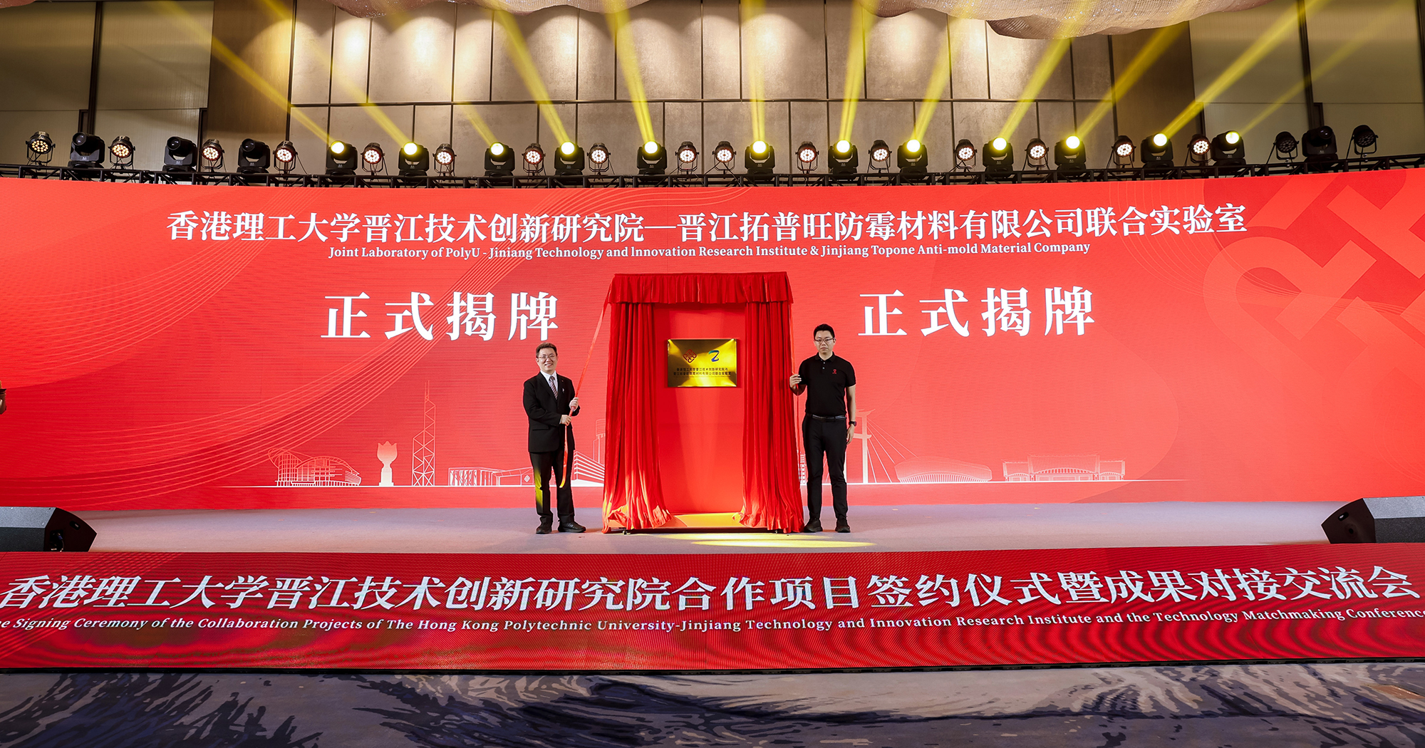 Prof Yu Changyuan, Director of the PolyU-Jinjiang Technology and Innovation Research Institute, and Mr He Shuidong, Chairman of Jinjiang Topone Anti-mold Material Company, unveiled the plaque for the establishment of the Joint Laboratory.