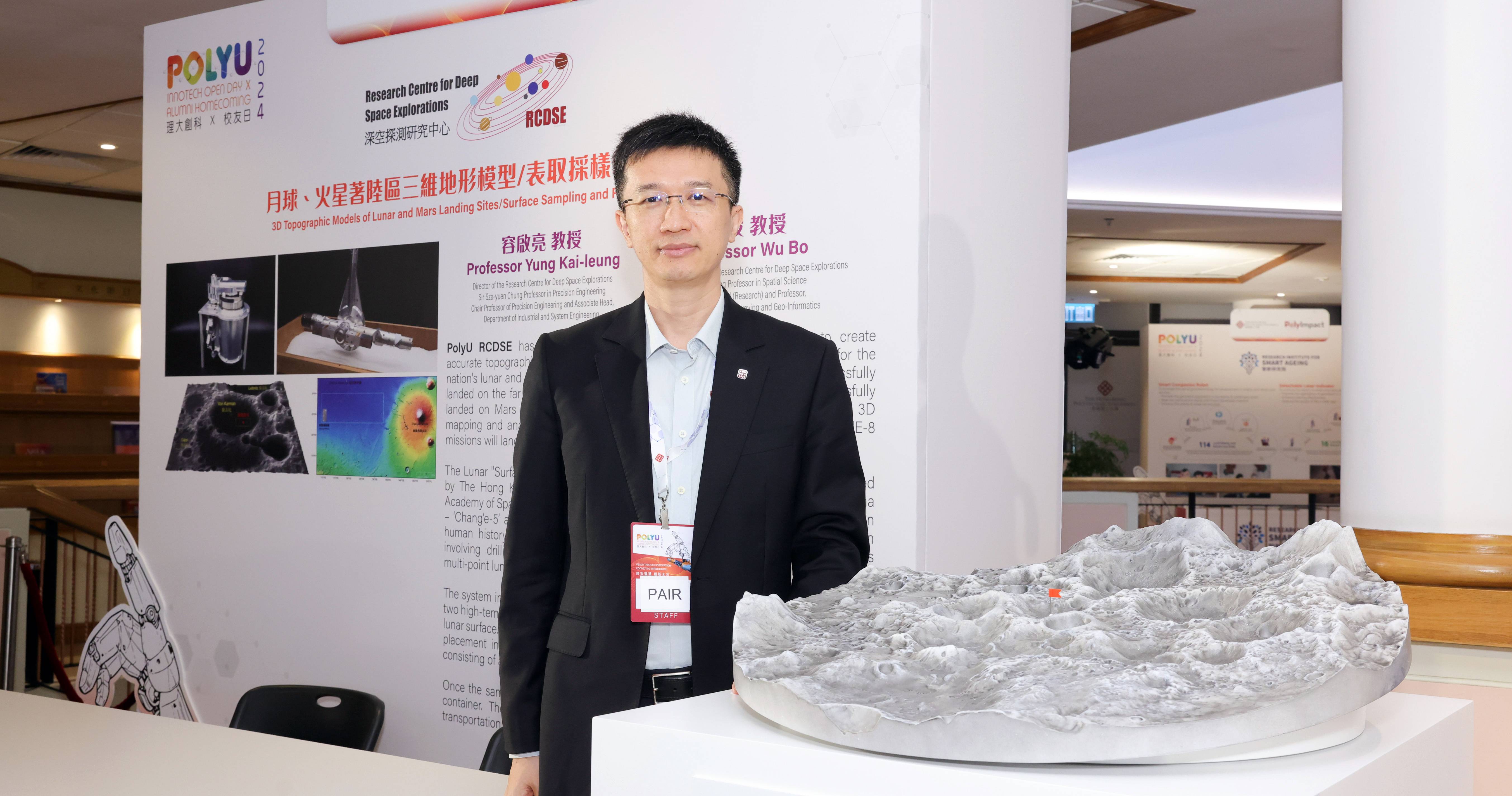 理大深空探測研究中心副主任吳波教授介紹顯示月球南極地形和景觀的創新 3D 模型。 |