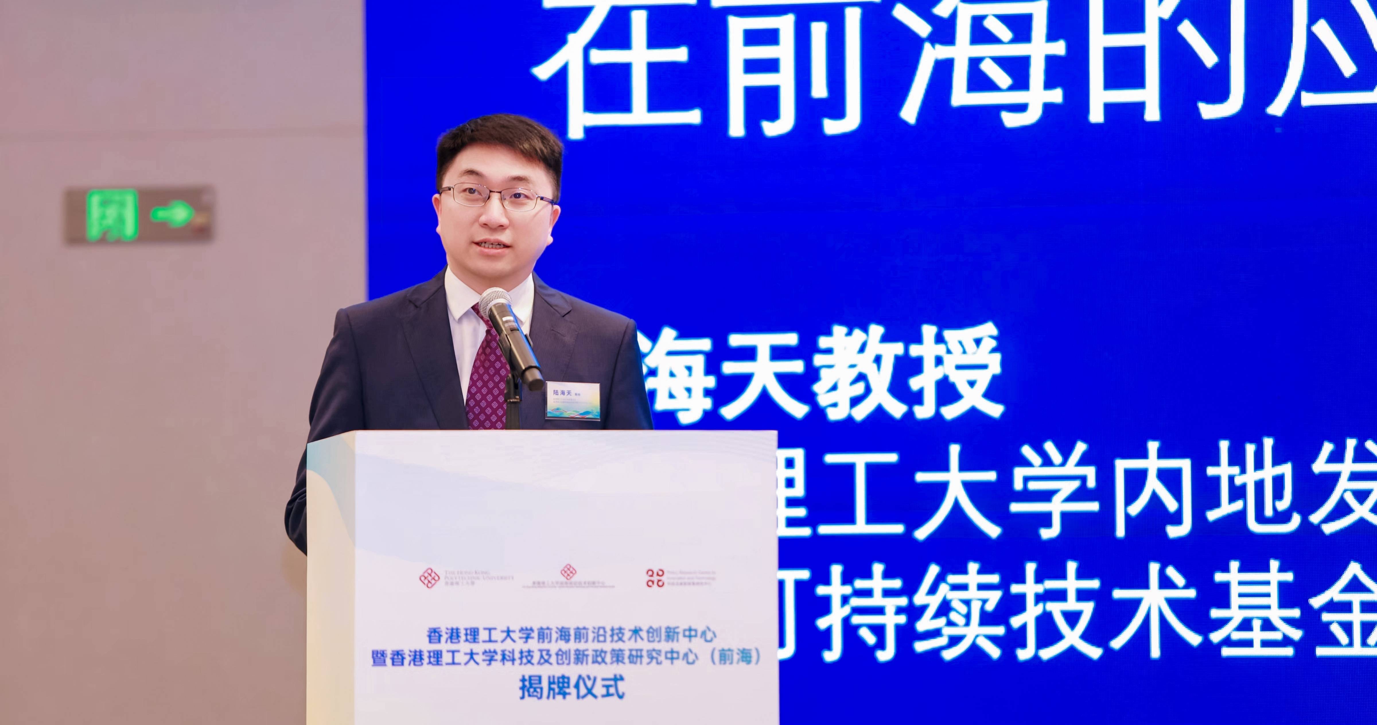 Prof. Haitian Lu introduced examples of the application and practice of PolyU’s research innovations in Qianhai. |