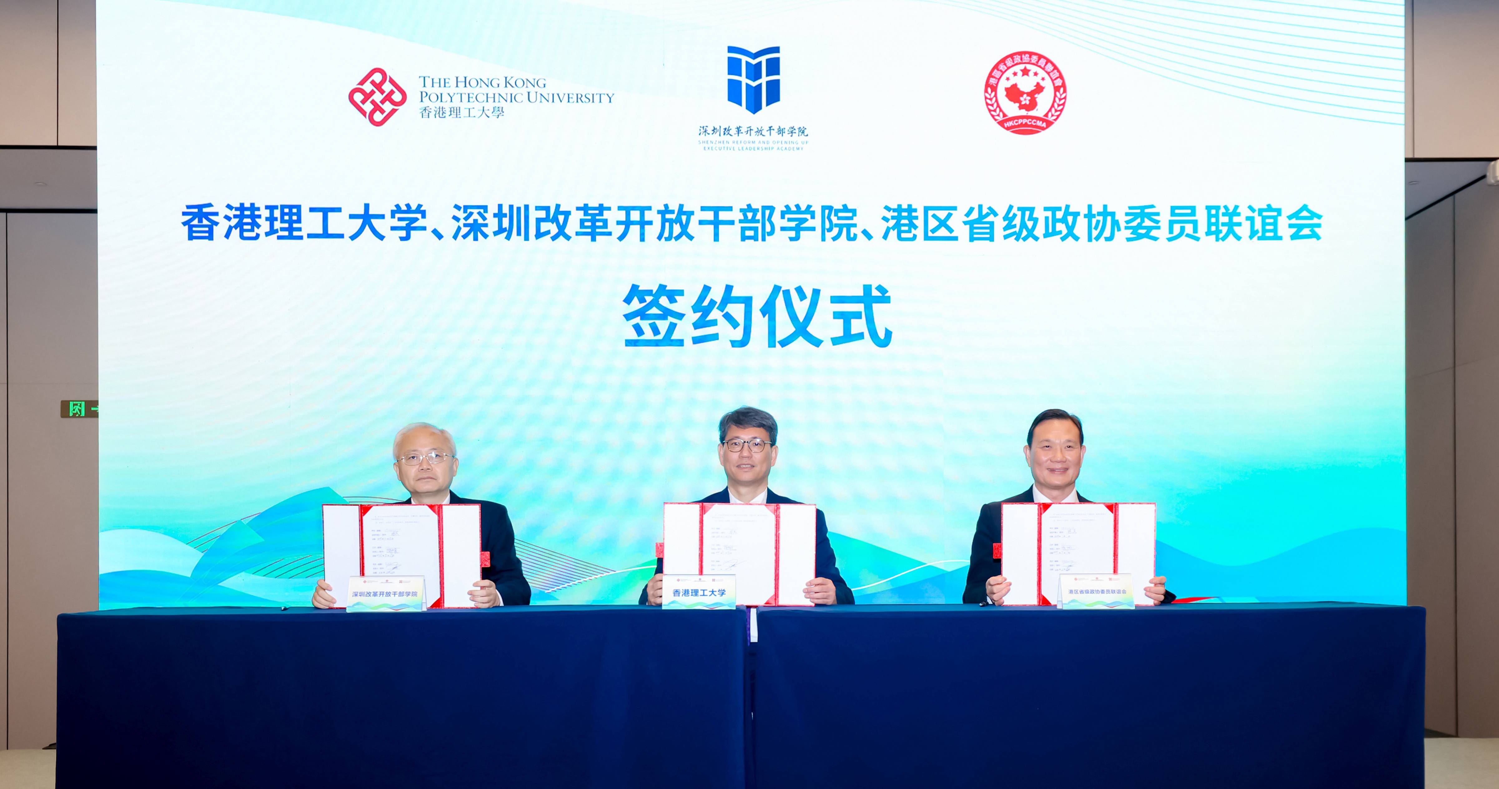 PolyU entered into MoUs with Shenzhen Reform and Opening Up Executive Leadership Academy and HKCPPCC (Provincial) Members Association. The agreements were signed by Prof. Christopher Chao (centre); Mr CHEN Min, Secretary of the Party Committee and President of Shenzhen Reform and Opening Up Executive Leadership Academy (left); and Mr WANG Ming Fan, Executive Vice President of the HKCPPCC (Provincial) Members Association and CPPCC National Committee Member (right). |