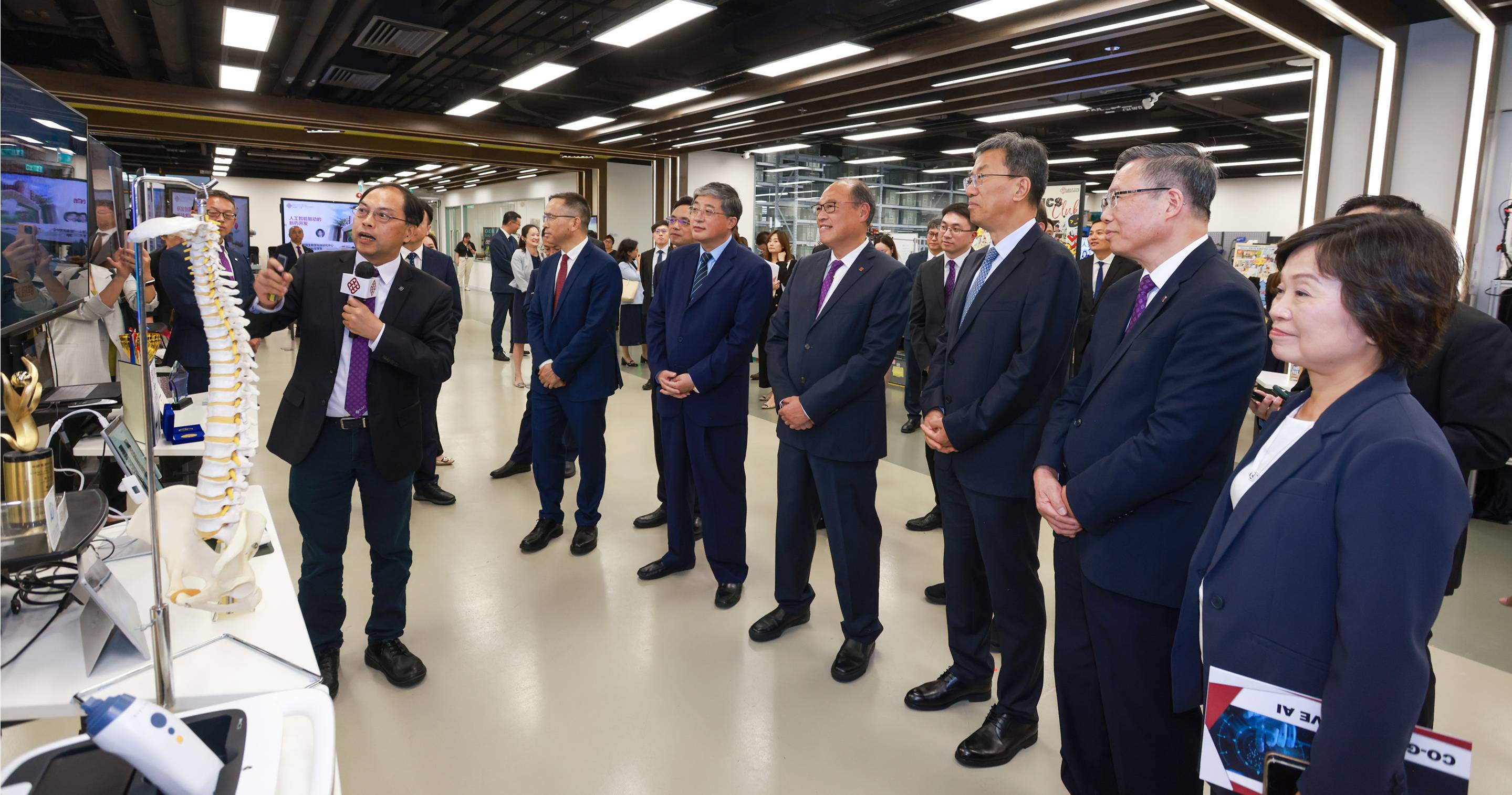 在理大校董會主席林大輝博士、校長滕錦光教授及一眾理大領導層陪同下,訪問團參觀了理大工業中心人工智能機器人實驗室,其間理大學者介紹和展示十個醫學、健康和人工智能相關領域的創新科研項目,充分展現理大在推動「醫工結合」及人工智能賦能醫學科研成果,如何引領新世代醫療發展。這些項目包括:協作生成式人工智能;可進行心血管疾病風險評估和常見眼疾篩查的人工智能眼底照相機;無輻射三維超聲脊柱側彎評估及無線掌上式超聲波脂肪肝和肝纖維化評估設備、人工智能賦能癌症精準診療的虛擬增強磁共振影像系統;支援中風患者遠端復康自動化管理功能的移動式外神經肌骨系統;可應用於醫學影像重建和分析的人工智能影像增強與復原技術;多肽新抗原疫苗技術平台─賦能精準癌症免疫治療;針對精神疾病客觀診斷、治療及病因解析的一體化人工智能、基因組學和生物醫學創新技術,以及人工智能驅動新結構抗生素候選藥物開發平台。