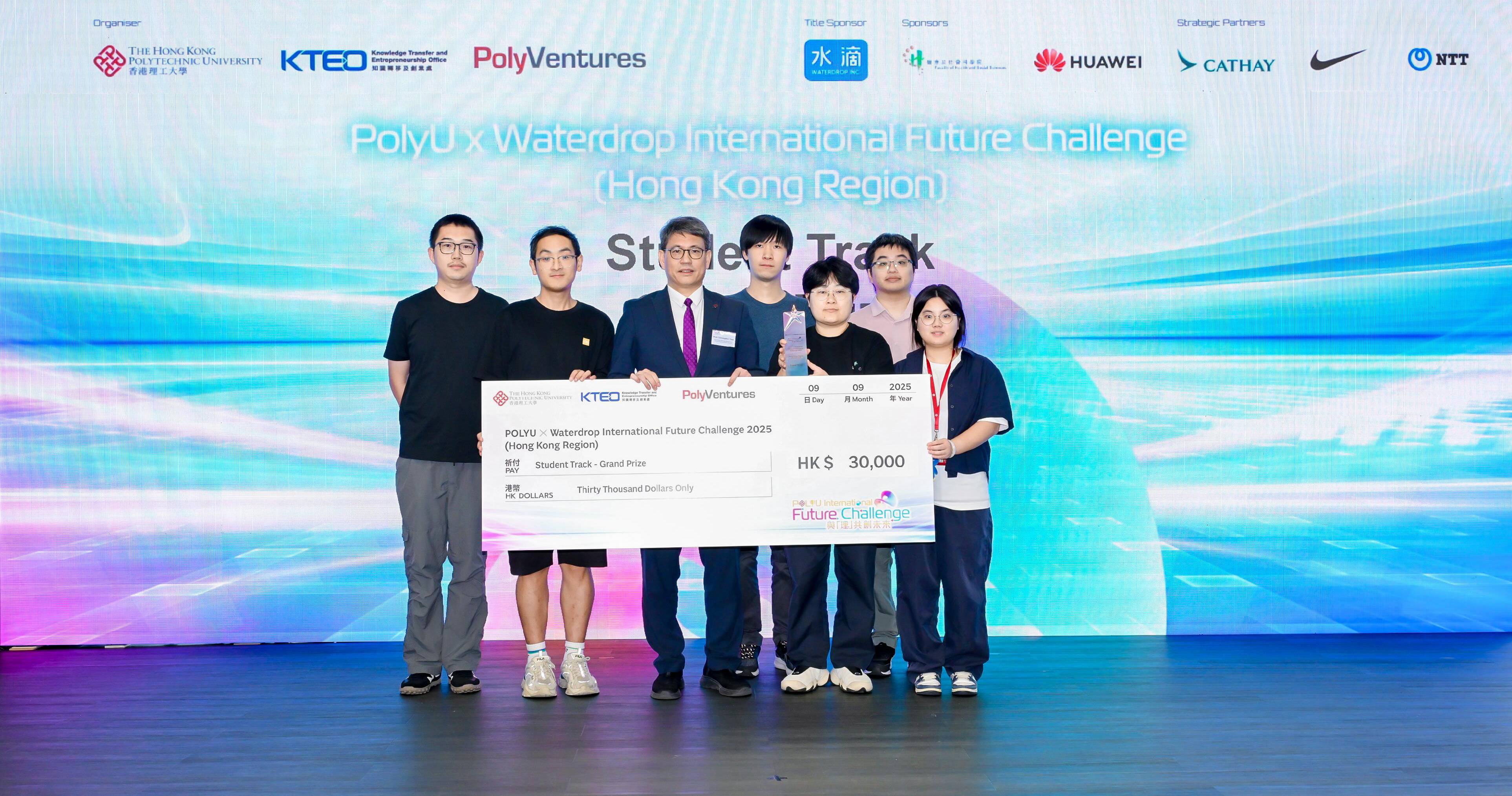 The PolyU International Future Challenge, the flagship innovation and entrepreneurship (I&E) competition of The Hong Kong Polytechnic University (PolyU), has attracted more than 700 outstanding teams worldwide to compete for cash prizes totalling over HK$2 million. The final of the PolyU × Waterdrop International Future Challenge (Hong Kong region) was held on the PolyU campus yesterday (9 September 2025). The top teams will advance to the Grand Final this December, where they will compete against the winning teams from six other regions.