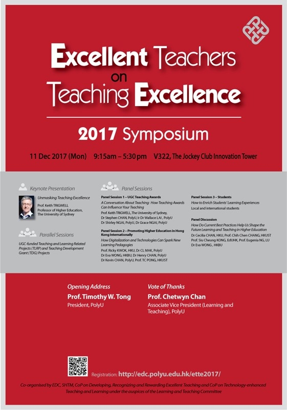 This year, the theme of the Symposium is "Teaching and Learning Excellence – Past, Present and Future". The highlights of the Symposium include a keynote speech by distinguished Professor Keith Trigwell from the University of Sydney, an external consultant engaged by the UGC to review teaching development initiatives in 2016-19, and sharing by UGC teaching award recipients and external education award winners from across institutions. In addition, there will be parallel sessions in which TDG and inter-institutional learning and teaching project leaders from UGC-funded institutions will present their project findings. This event will be open to all UGC-funded institutions as a celebration of teaching excellence.