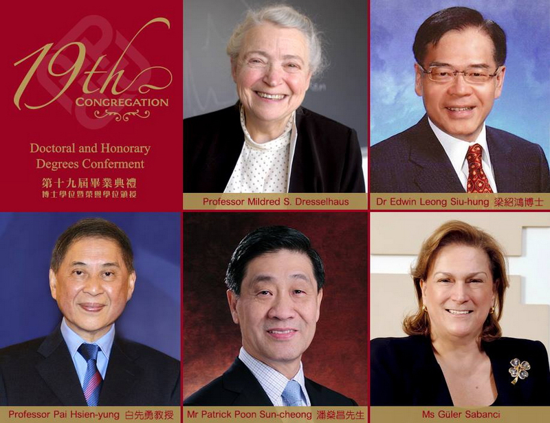 理大将于十月二十七日举行的第十九届毕业典礼上,颁授荣誉博士学位予五位杰出人士,以表彰他们的卓越成就及贡献。 他们包括美国麻省理工学院物理及电机工程荣休教授Mildred S. Dresselhaus教授、大鸿辉集团创办人兼主席梁绍鸿博士、当代著名作家及振兴昆曲重要推手白先勇教授、利承昌集团有限公司主席潘燊昌先生,以及土耳其Sabanci控股公司主席兼总经理及Sabanci大学创校校长Güler Sabanci女士。详情>>