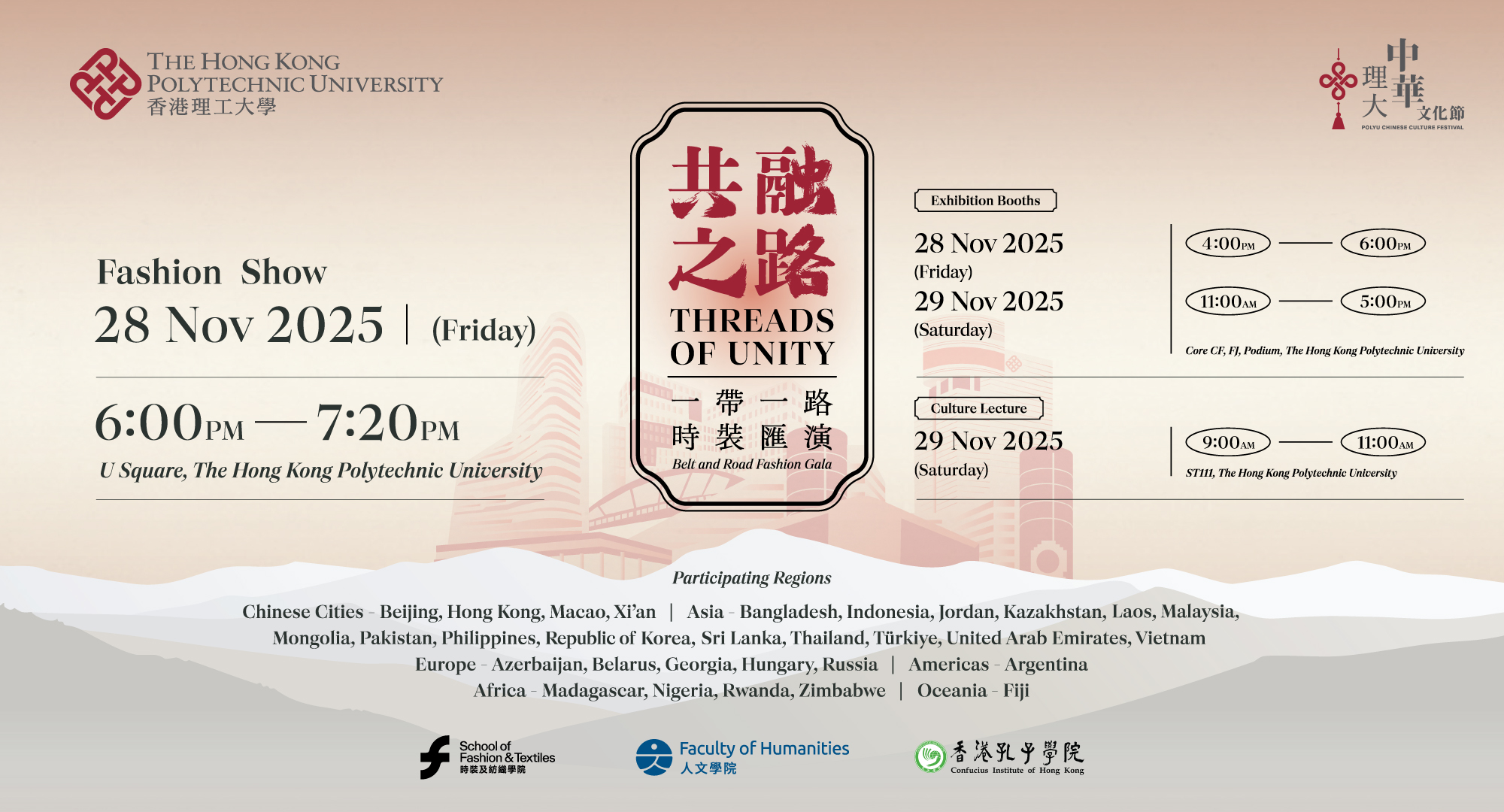 As a dynamic gateway connecting China to the world, Hong Kong plays a crucial role in the “Belt and Road Initiative”, creating opportunities for its creative sectors. PolyU proudly presents the two-day “Threads of Unity: Belt & Road Fashion Show”. Jointly-organised by the School of Fashion and Textiles, the Faculty of Humanities, and the Confucius Institute, the show features a dazzling array of fashion show, exhibitions, cultural lecture, and workshop that celebrate creativity and Chinese cultural heritage. |