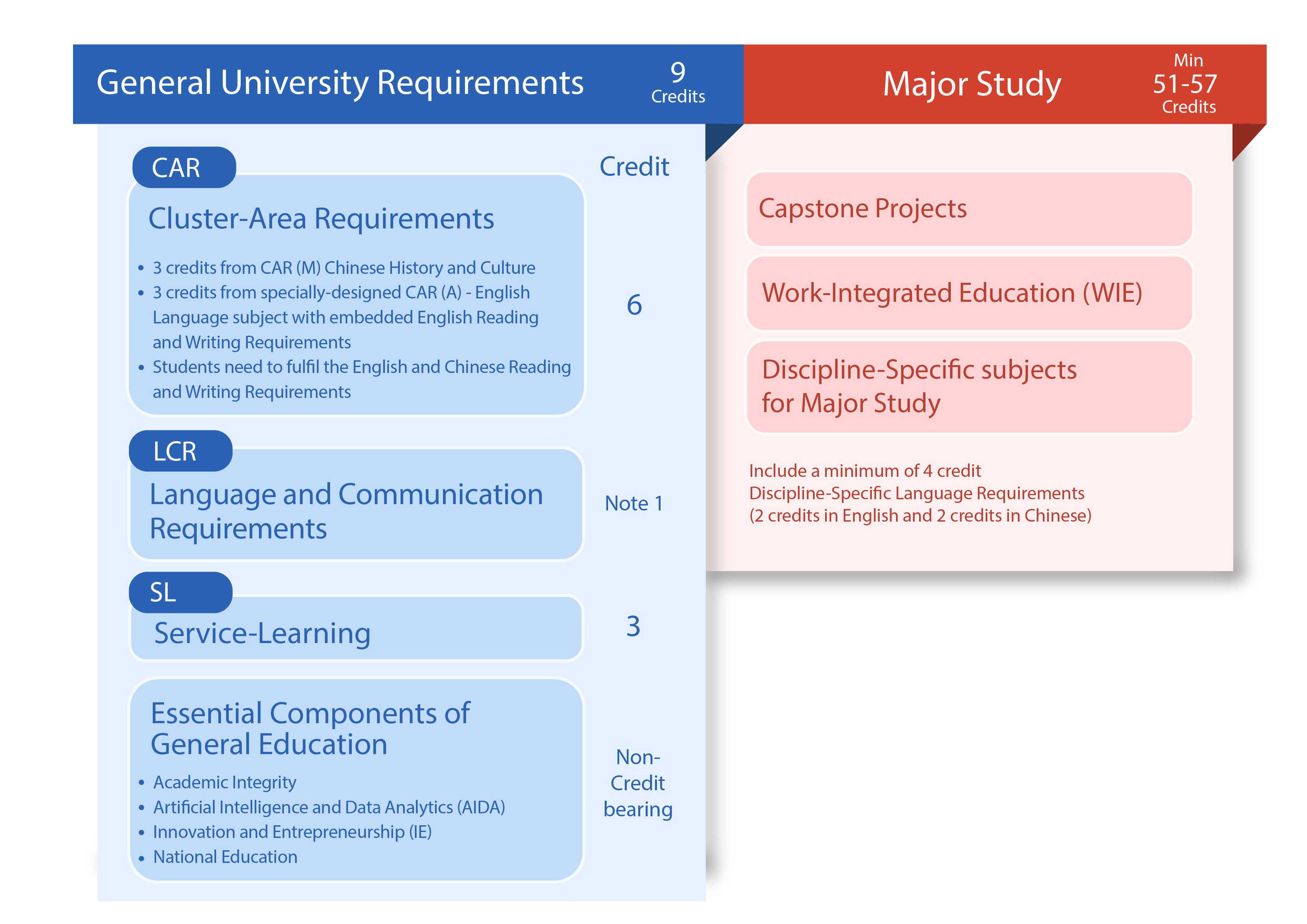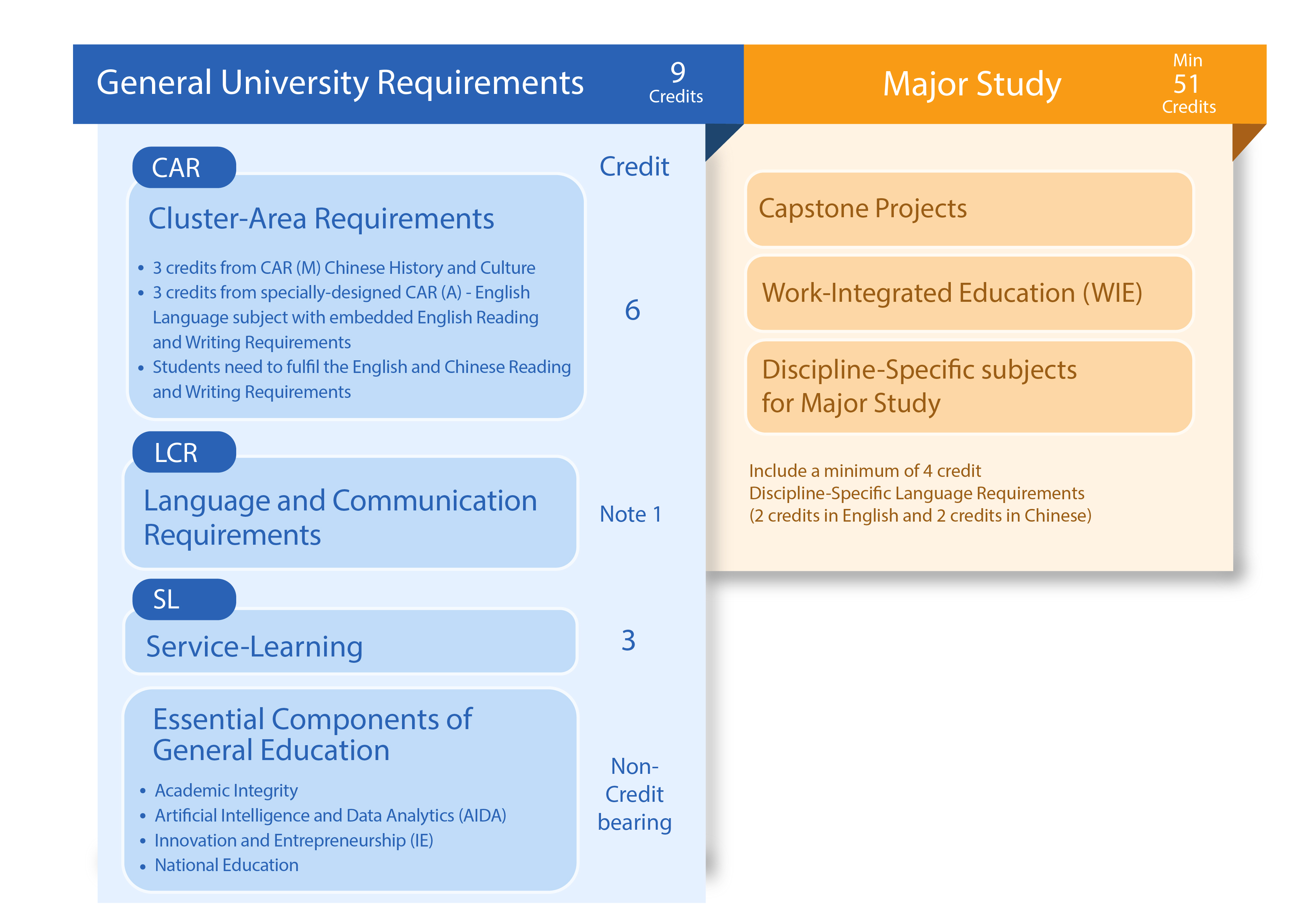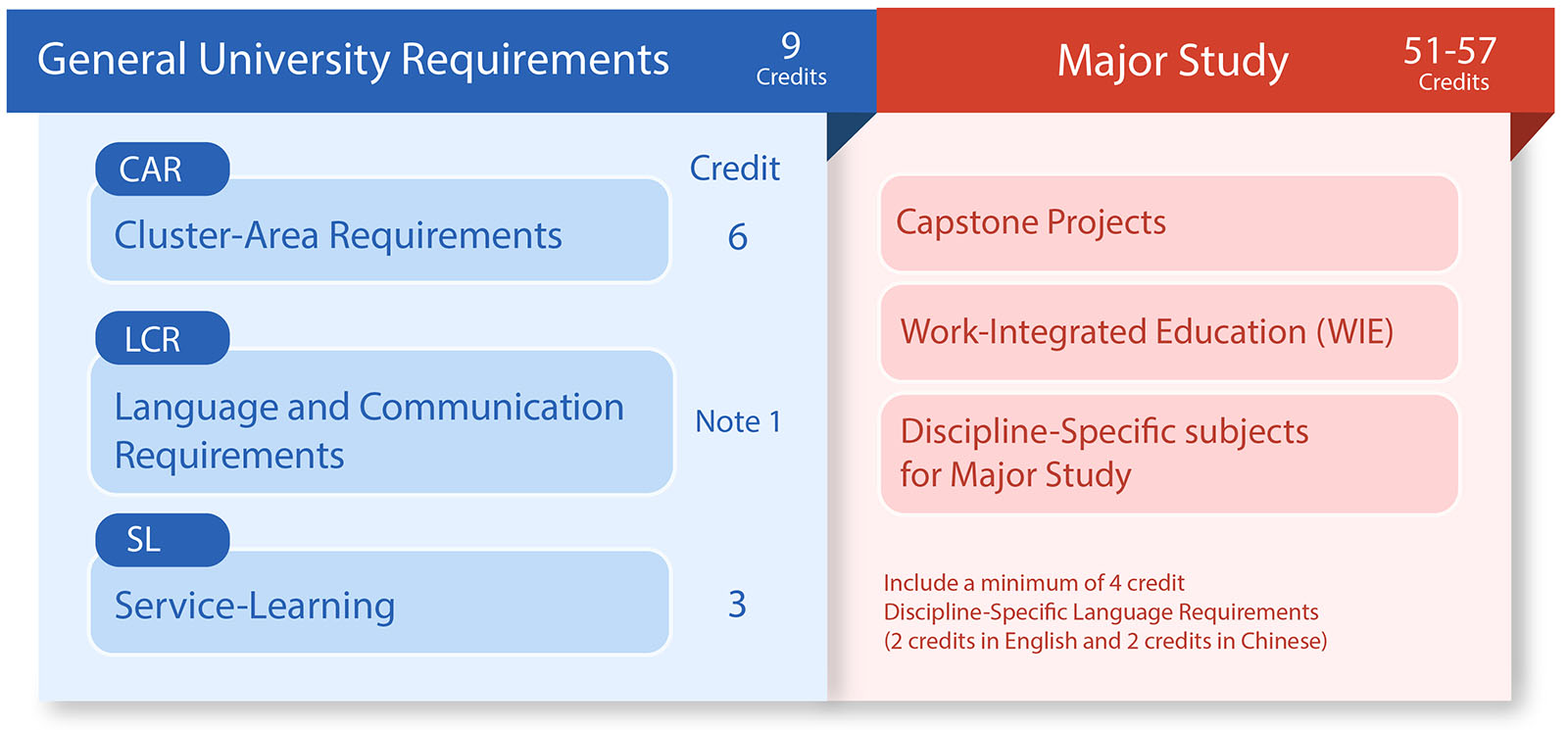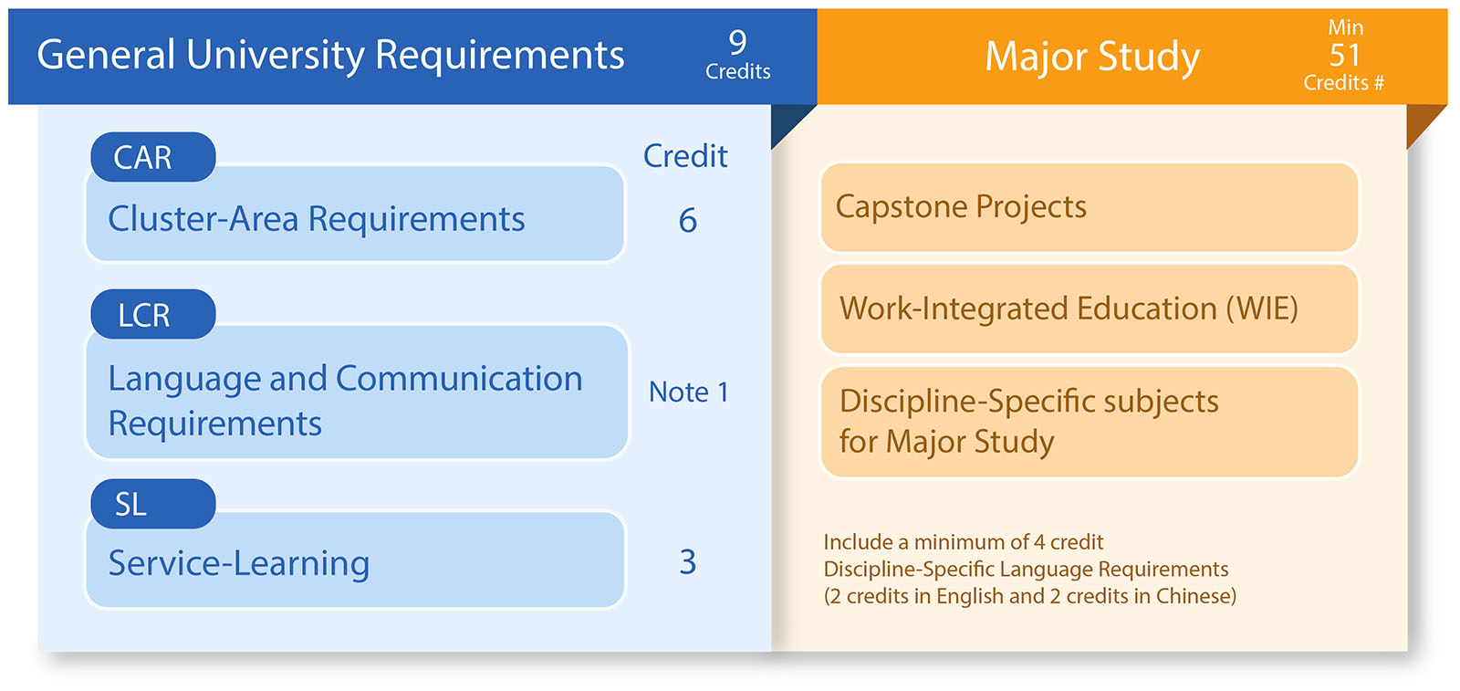Similar to students admitted to articulation degree programmes, Senior Year intake students will follow a reduced GUR curriculum. The curriculum framework for Senior Year intakes is provided as follows: