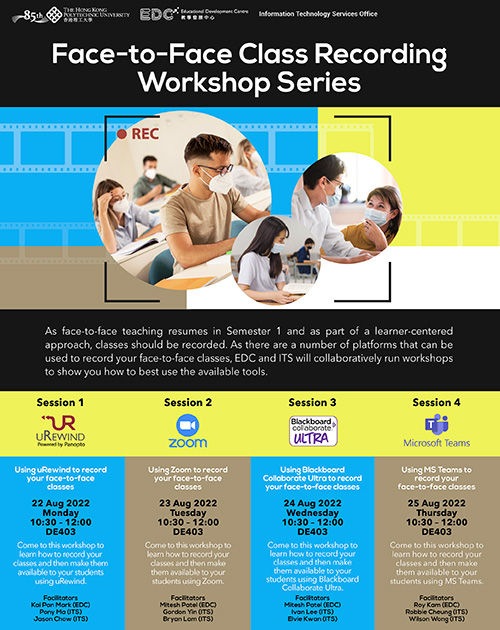 As face-to-face teaching resumes in Semester 1 and as part of a learner-centered approach, classes should be recorded. As there are a number of platforms that can be used to record your face-to-face classes, EDC and ITS will collaboratively run workshops to show you how to best use the available tools.