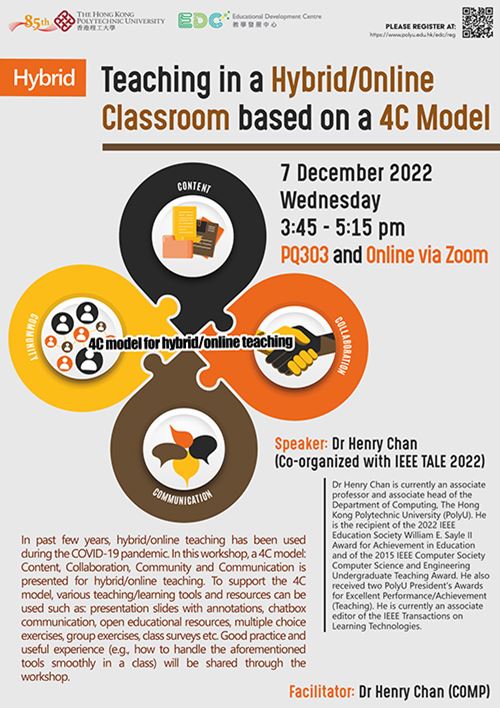 In past few years, hybrid/online teaching has been used during the COVID-19 pandemic. In this workshop, a 4C model: Content, Collaboration, Community and Communication is presented for hybrid/online teaching. To support the 4C model, various teaching/learning tools and resources can be used such as: presentation slides with annotations, chatbox communication, open educational resources, multiple choice exercises, group exercises, class surveys etc. Good practice and useful experience (e.g., how to handle the aforementioned tools smoothly in a class) will be shared through the workshop.