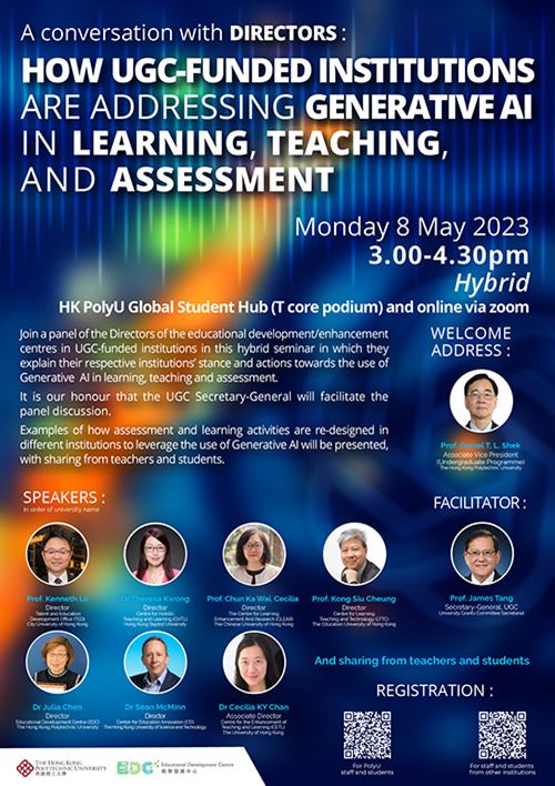 Join a panel of the Directors of the educational development/enhancement centres in UGC-funded institutions in this hybrid seminar in which they explain their respective institutions’ stance and actions towards the use of Generative AI in learning, teaching and assessment.
