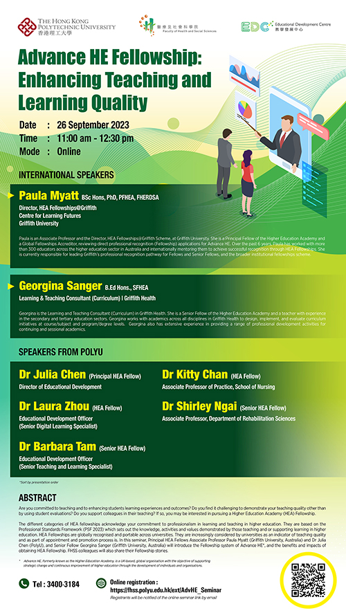 The different categories of HEA fellowships acknowledge your commitment to professionalism in learning and teaching in higher education. They are based on the Professional Standards Framework (PSF 2023) which sets out the knowledge, activities and values demonstrated by those teaching and or supporting learning in higher education. HEA Fellowships are globally recognised and portable across universities. They are increasingly considered by universities as an indicator of teaching quality and as part of appointment and promotion process is. In this seminar, Principal HEA Fellows Associate Professor Paula Myatt (Griffith University, Australia) and Dr Julia Chen (PolyU), and Senior Fellow Georgina Sanger (Griffith University, Australia) will introduce the Fellowship system of Advance HE*, and the benefits and impacts of obtaining HEA Fellowship. FHSS colleagues will also share their Fellowship stores.
