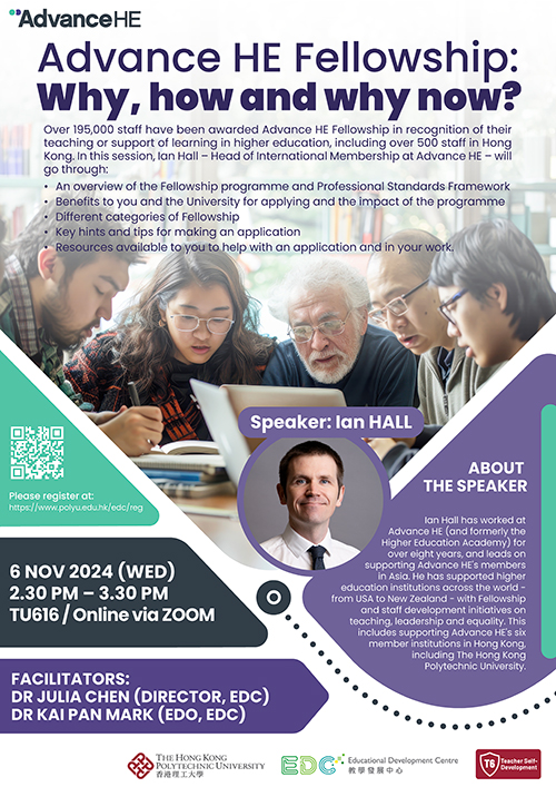 Over 195,000 staff have been awarded Advance HE Fellowship in recognition of their teaching or support of learning in higher education, including over 500 staff in Hong Kong. In this session, Ian Hall – Head of International Membership at Advance HE – will go through: