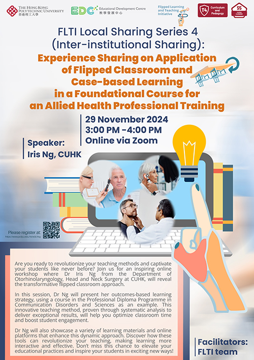 Are you ready to revolutionize your teaching methods and captivate your students like never before? Join us for an inspiring online workshop where Dr Iris Ng from the Department of Otorhinolaryngology, Head and Neck Surgery at CUHK, will reveal the transformative flipped classroom approach.