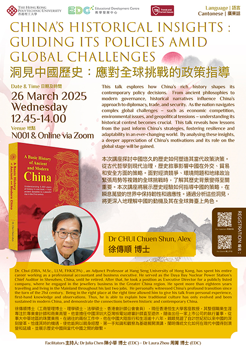 本次講座探討中國悠久的歷史如何塑造其當代政策決策。從古代哲學到現代治理,歷史敘事影響中國在外交、貿易和安全方面的策略。面對經濟競爭、環境問題和地緣政治緊張局勢等複雜的全球挑戰時,了解其歷史背景變得至關重要。本次講座將展示歷史經驗如何指導中國的策略,在瞬息萬變的世界中保持韌性和適應性。通過分析這些洞見,將更深入地理解中國的動機及其在全球舞臺上角色。