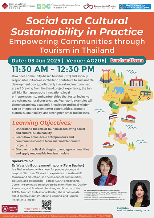 How does community-based tourism (CBT) and socially responsible initiatives in Thailand contribute to sustainable development goals, particularly in rural and marginalised areas? Drawing from firsthand project experience, the talk will highlight grassroots innovations, local entrepreneurship, and partnerships that foster inclusive growth and cultural preservation. Real-world examples will demonstrate how academic knowledge and local wisdom can be integrated to empower communities, promote cultural sustainability, and strengthen small businesses.