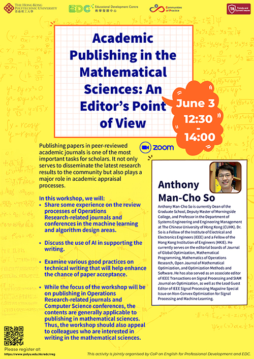 While the focus of the workshop will be on publishing in Operations Research-related journals and Computer Science conferences, the contents are generally applicable to publishing in mathematical sciences. Thus, the workshop should also appeal to colleagues who are interested in writing in the mathematical sciences.