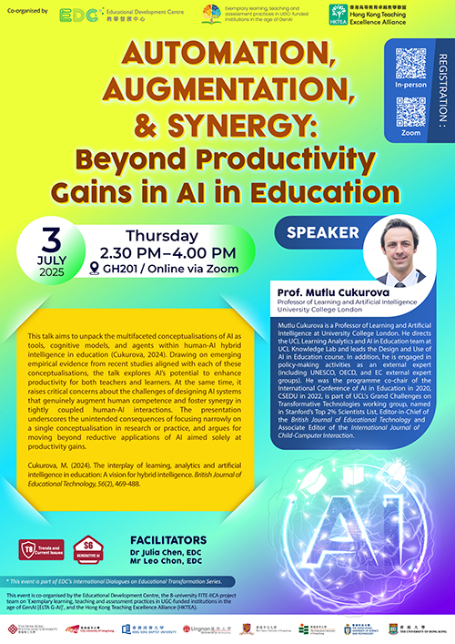This talk aims to unpack the multifaceted conceptualisations of AI as tools, cognitive models, and agents within human-AI hybrid intelligence in education (Cukurova, 2024). Drawing on emerging empirical evidence from recent studies aligned with each of these conceptualisations, the talk explores AI’s potential to enhance productivity for both teachers and learners. At the same time, it raises critical concerns about the challenges of designing AI systems that genuinely augment human competence and foster synergy in tightly coupled human-AI interactions. The presentation underscores the unintended consequences of focusing narrowly on a single conceptualisation in research or practice, and argues for moving beyond reductive applications of AI aimed solely at productivity gains.