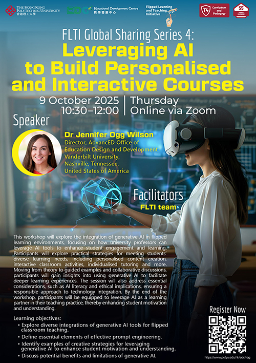 This workshop will explore the integration of generative AI in flipped learning environments, focusing on how university professors can leverage AI tools to enhance student engagement and learning. Participants will explore practical strategies for meeting students’ diverse learning needs, including personalised content creation, interactive classroom activities, individualised tutoring and more. Moving from theory to guided examples and collaborative discussions, participants will gain insights into using generative AI to facilitate deeper learning experiences. The session will also address essential considerations, such as AI literacy and ethical implications, ensuring a responsible approach to technology integration. By the end of the workshop, participants will be equipped to leverage AI as a learning partner in their teaching practice, thereby enhancing student motivation and understanding.