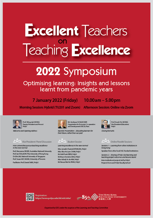 ETTE is an annual learning and teaching event in PolyU’s tradition that attracts participation from local academics, overseas speakers, and students. The ETTE Symposium 2022 will be conducted in a hybrid mode in the morning and completely online in the afternoon, with a strong focus on reflecting and sharing the insights and lessons learnt from online/hybrid learning and teaching in the pandemic years. We are pleased to have Mr Andreas Schleicher, Director for Education and Skills at the Organisation for Economic Co-operation and Development (OECD) in Paris, as our Keynote Speaker, four UGC Teaching Awardees in 2020 and 2021 online, as well as nominated teachers from both PolyU and other local universities for their good practices in virtual teaching and learning.