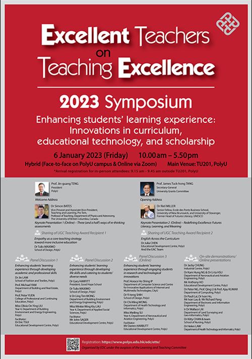 The ETTE Symposium 2023 will be a full-day event conducted in a hybrid mode, with a focus on enhancing students’ learning experience through innovations in the curriculum, educational technology, and scholarship. We are very honoured to have a Welcome Address by our President, Professor Jin-guang Teng, an Opening Address by the Hong Kong UGC Secretary-General, Professor James Tang, and sharing by two PolyU recipients of the 2022 UGC Teaching Awards, which will all be conducted in person. These will be followed by an online Keynote Presentation by Dr Simon Bates, Vice Provost and Associate Vice President in Teaching and Learning, the University of British Columbia, and two hybrid Panel Discussions by academic staff, undergraduate students, and educators from other institutions. The afternoon session will include a second online Keynote Presentation by Dr Riel Miller, Senior Fellow of the Ecole des Ponts Business School, University of New Brunswick, and University of Stavanger; and Former Head of Futures Literacy, UNESCO, and a third Panel Discussion online by academic staff, a student, and an academic from another local institution.