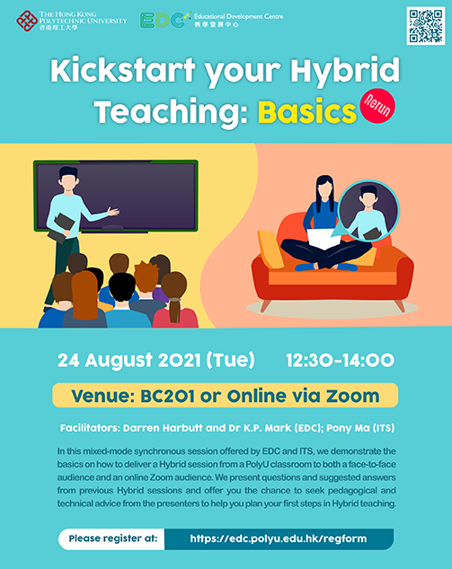 In this mixed-mode synchronous session offered by EDC and ITS, we demonstrate the basics on how to deliver a Hybrid session from a PolyU classroom to both a face-to-face audience and an online Zoom audience. We present questions and suggested answers from previous Hybrid sessions and offer you the chance to seek pedagogical and technical advice from the presenters to help you plan your first steps in Hybrid teaching.