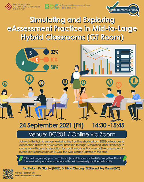 Join us in this hybrid session featuring the frontline sharing from BEEE colleagues to experience different eAssessment practice through 'Simulating' and 'Exploring' to come up with practical solution for continuous and/or summative assessment in hybrid classrooms such as BC201 the Mid-Large Classroom this time.