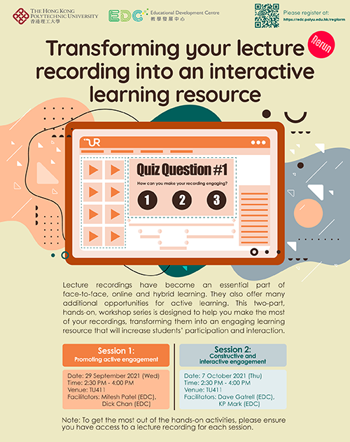 Lecture recordings have become an essential part of face-to-face, online and hybrid learning. They also offer many additional opportunities for active learning. This two-part, hands-on, workshop series is designed to help you make the most of your recordings, transforming them into an engaging learning resource that will increase students’ participation and interaction.