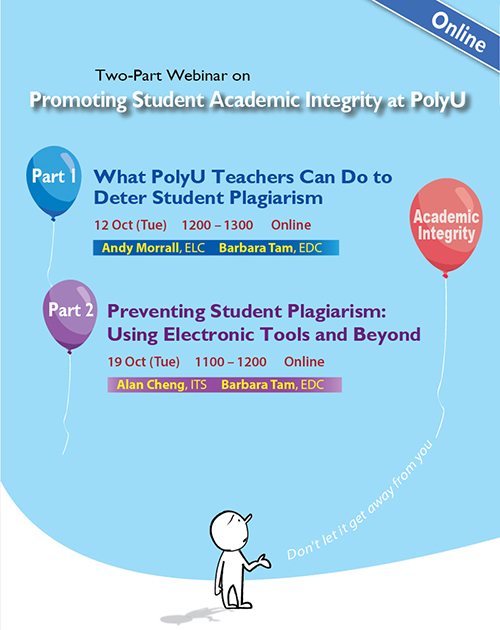 PolyU has a policy to further educate students about the importance of honest behaviours in academic pursuits, and offers opportunities for academic staff to detect cases of suspected plagiarism and take necessary actions. This webinar discusses the "what, why and how" of student plagiarism, suggests strategies to help students avoid plagiarism, and introduces resources and support for PolyU.