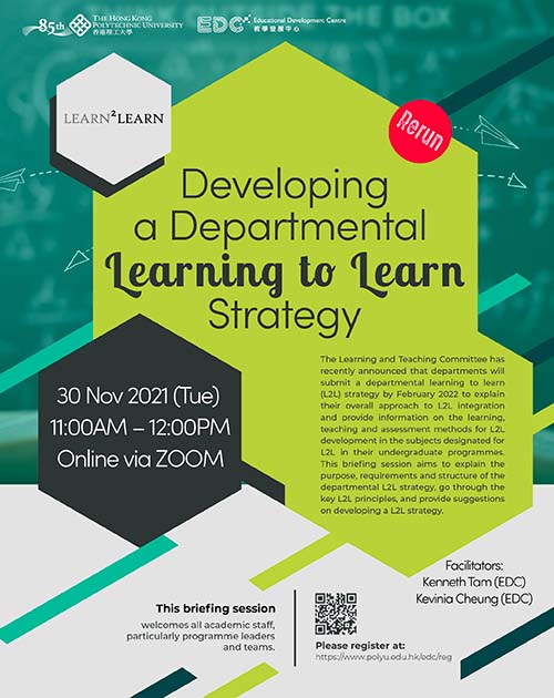 The Learning and Teaching Committee has recently announced that departments will submit a departmental learning to learn (L2L) strategy by February 2022 to explain their overall approach to L2L integration and provide information on the learning, teaching and assessment methods for L2L development in the subjects designated for L2L in their undergraduate programmes. This briefing session aims to explain the purpose, requirements and structure of the departmental L2L strategy, go through the key L2L principles, and provide suggestions on developing a L2L strategy.